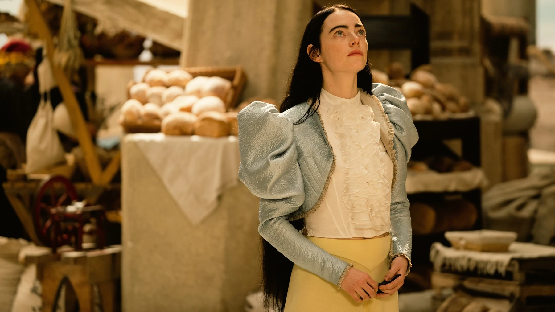 Bella Baxter ruháinak esetében a kosztümök tervezőjének persze azzal is számolnia kellett, hogy egészen más megjelenést kellett adnia a felnőtteket utánozni akaró „gyermeki Bellának” és az éppen saját szexualitását próbálgató „felnőtt Bellának.”