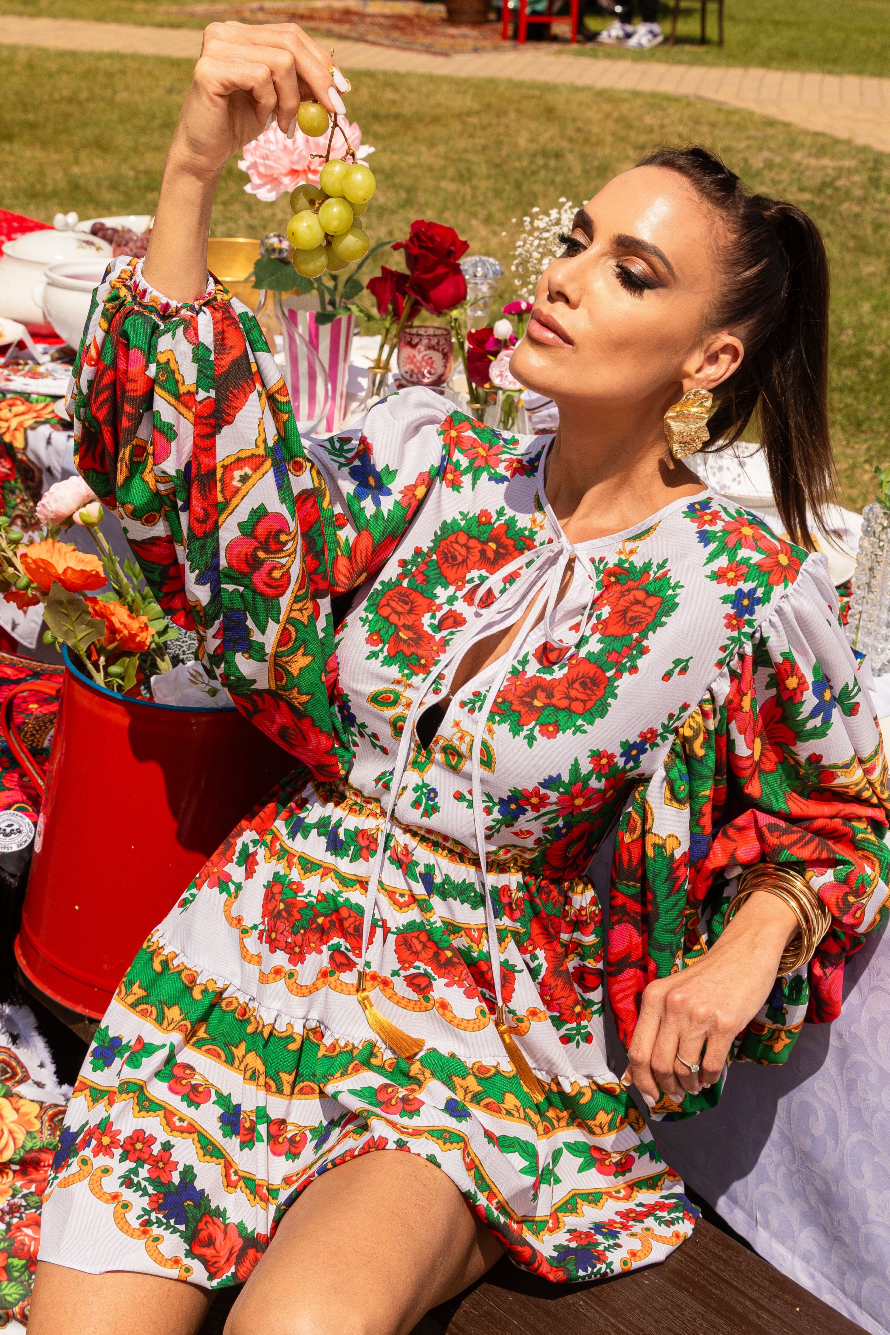 Az elvarázsolt helyszínen olyan érzésünk volt, mintha egy roma lagzi eszem-iszomjába csöppennénk. A kifutón a virágmotívumok mellett a ruhákon megjelent a csipke, a kendő pedig mindegyik szetthez fontos kiegészítő volt.