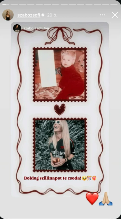 37. születésnapját ünnepli Szabó Zsófi, mely alkalomból Instagram oldalán osztott meg szebbnél szebb pillanatokat. Van köztük tortás videó, szelfi montázs és egy édes kis levél a kisfiától, Mendeltől is. Emellett pedig egy gyerekkori fotó is felbukkant Zsófiról, melynek láttán egyszerűen elolvadunk!