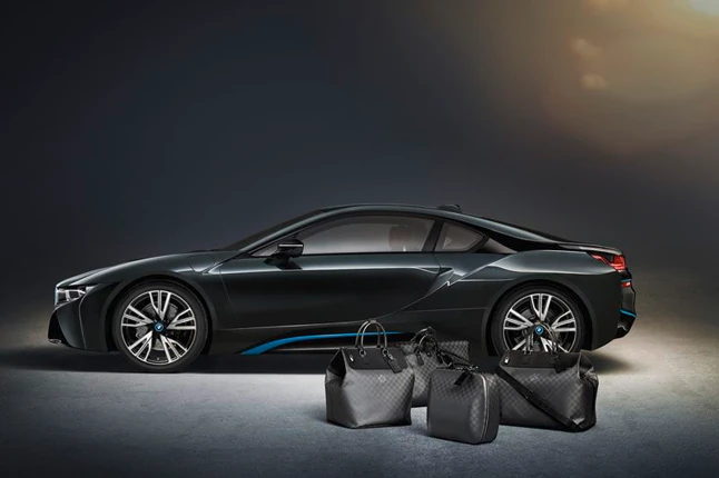 A Louis Vuitton egy négydarabos táskakollekciót készített kifejezetten az i8-as modellhez. A különleges kialakítású, szénszálas darabok tökéletesen passzolnak az autó tereibe, ráadásul többféle funkcióra kínálnak megoldás. Egy ruhaszállító táska mellett, egy nagyobb és egy kisebb utazótáska és egy aktatáska alkotja a speciális szériát. Az uniszex darabok kockás mintázata egyszerre idézi meg a BMW logóját és a Louis Vuitton jellegzetets díszítőelemét.