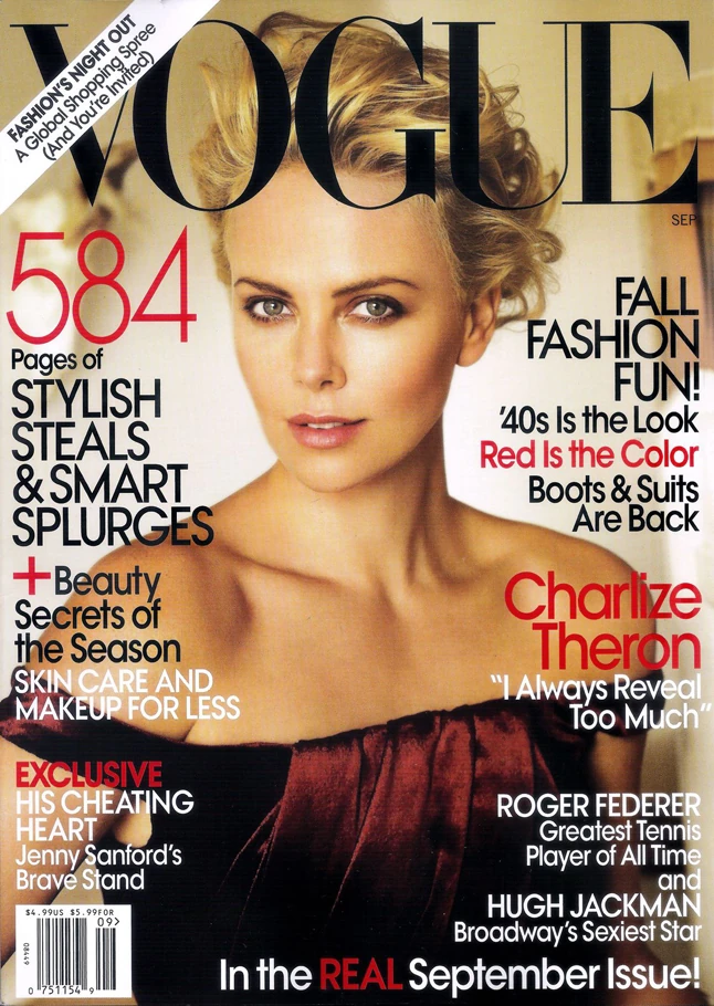 2009: Charlize Theron – A szépséges színésznő előkelően mosolyog a Vogue 2009-es szeptemberi számának a címlapján, melyet Mario Testino fotózott.
