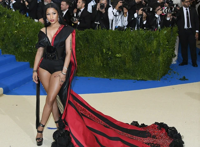 Nicki Minaj egy könnyű tüllruhát viselt uszállyal, melynek bőr Obi övén Kawakubo arcát ábrázóló maszk kapott helyet.