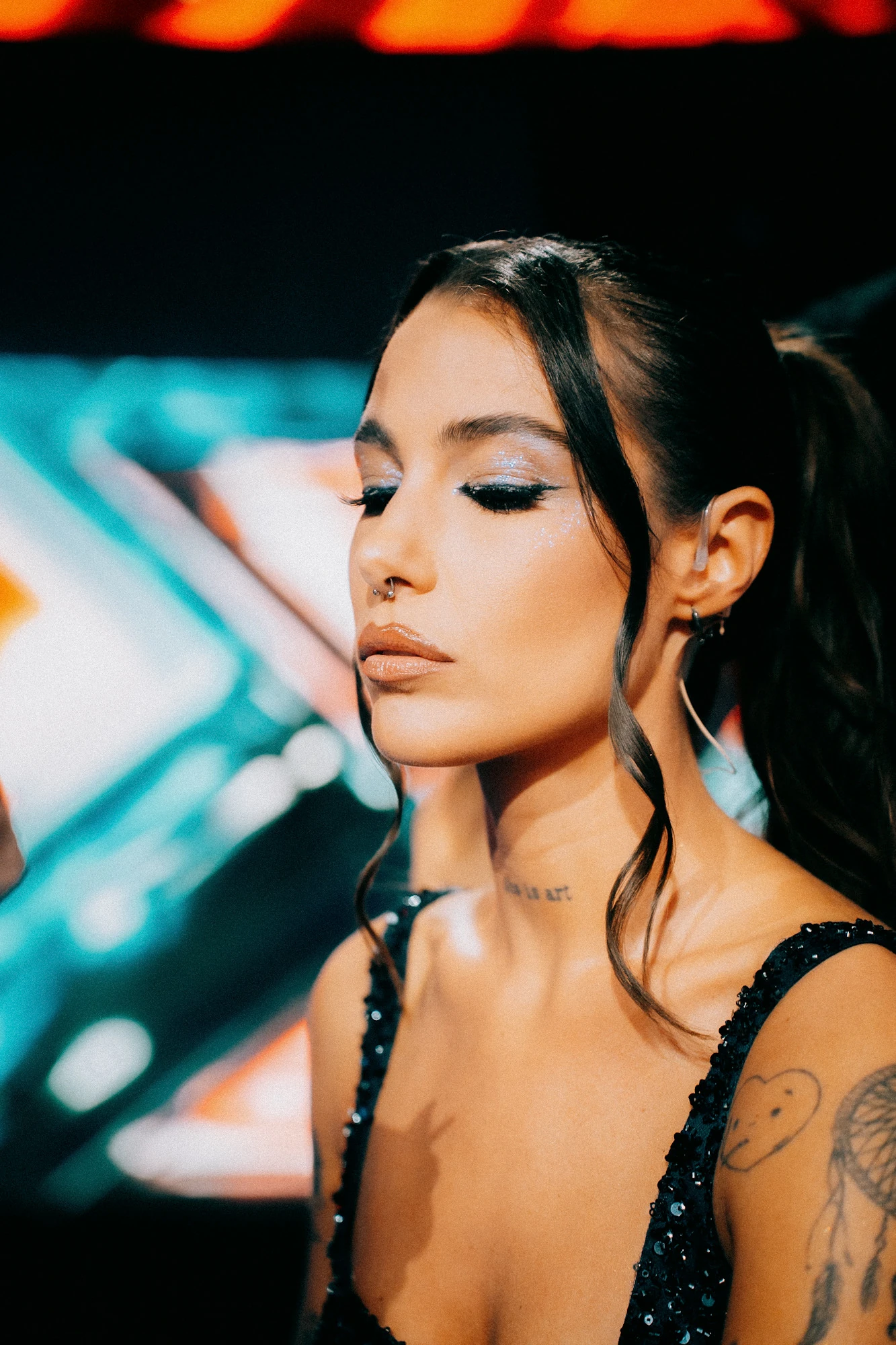 Az első élő show ruháját két dolog inspirálta: az egyik a ’90-es évek letisztult, klasszikus, pántos miniruha formája, illetve egy sminktermék, amit Andi rendelt magának az első élő adásra. Abból készített neki Bényei Betti egy csodás, Euphoria inspirálta sminket. Annak a színéhez választottam a színt és a textúrát is.