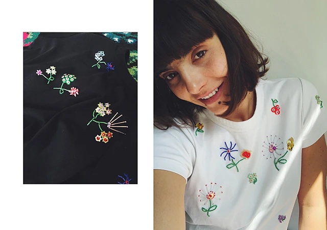 Sokat rajzolok és hímzek gyöngyből virágokat. Pólóra, ruhára, párnahuzatra. Először csak a saját pólóimat kezdtem dekorálni, majd a barátnőimnek is készítettem. Nem szerettem volna kollekcióként gondolkodni róla, hiszen csak a saját kedvemre csinálom, de most már látom, hogy ez valószínűleg a márkát is el fogja érni. Eddig is jellemző volt, hogy kézzel díszített 'show piece' darabok is kimentek a kifutón, így jobban szeretnék koncentrálni ezekre a jövőben.