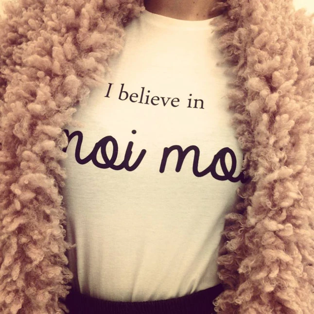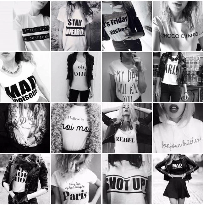 Ha az ember kreatív, akkor egyszerűen mindenhonnan tud inspirálódni. Van, hogy egy élethelyzet szül meg egy idézetet, vagy meghallok egy zenét és onnan ugrik be valami, de olyan is volt már, hogy megálmodtam egy szójátékot, és ahogy felébredtem, neki is álltam megtervezni. Szeretek az angol szavakkal is játszani, az igény is nagyobb rá egyelőre. Bevallom őszintén, többször fordult már elő olyan is, hogy egy a mainstream közösségi média oldalon (Tumblr, We heart it, Instagram) megtalálható szöveget kértek tőlem, amit szívesen megterveztem, és ugyanúgy kitettem az oldalra, hiszen ezekre is ugyanúgy nagy az igény. De a terveim nagyrészét én találom ki, és ragaszkodom egyébként a minimál stílushoz. Szerintem egy ütős szöveggel, vagy akár egyetlen szóval ellátott fehér basic póló vagy atléta egyszerűen bármelyik outfitben és napszakban megállja a helyét. Ha nincs kedvem azon agyalni, hogy mit vegyek fel, akkor csak előkapok egy Moi Moi pólót a szekrényemből, egy farmert, egy bőrdzsekit, esetleg zakót, converse-t, vagy ha este van, magassarkút, és kész is. Ettől lesz ez a letiszult, időtlen klasszikus szett stílusosan egyedi.