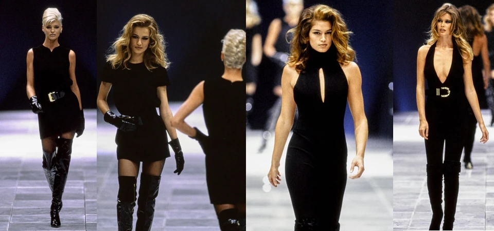 A Fiera Milano kiállítóterében szinte sötétben csendül fel az előző év végének megaslágere, George Michael Freedom! ´90 című dala, és a 15 méter hosszú márványkifutóra kilép tiszta fekete szettben a peroxidszőke hajú Linda Evangelista. Ujjatlan kisfeketét visel, hangsúlyos aranycsatos övvel, a megjelenését a fekete bőrkesztyű és a combközépig érő lakkhatású fekete bőrcsizma egészíti ki, így a mindig kissé szigorúnak tűnő szupermodell kicsit olyan, mint egy domina. Nagyon hasonló szettben, fekete pólóruhában követi őt Karen Mulder, a holland gyönyörűségről se kellett annak idején megmagyarázni, hogy kicsoda. Cindy Crawford mellrészen kivágott ujjatlan fekete overallban vonul, jön Claudia Schiffer mélyen kivágott fekete felsőben, hogy fokozza a hatást, unott kacérsággal végigsimítja a dekoltázsát.