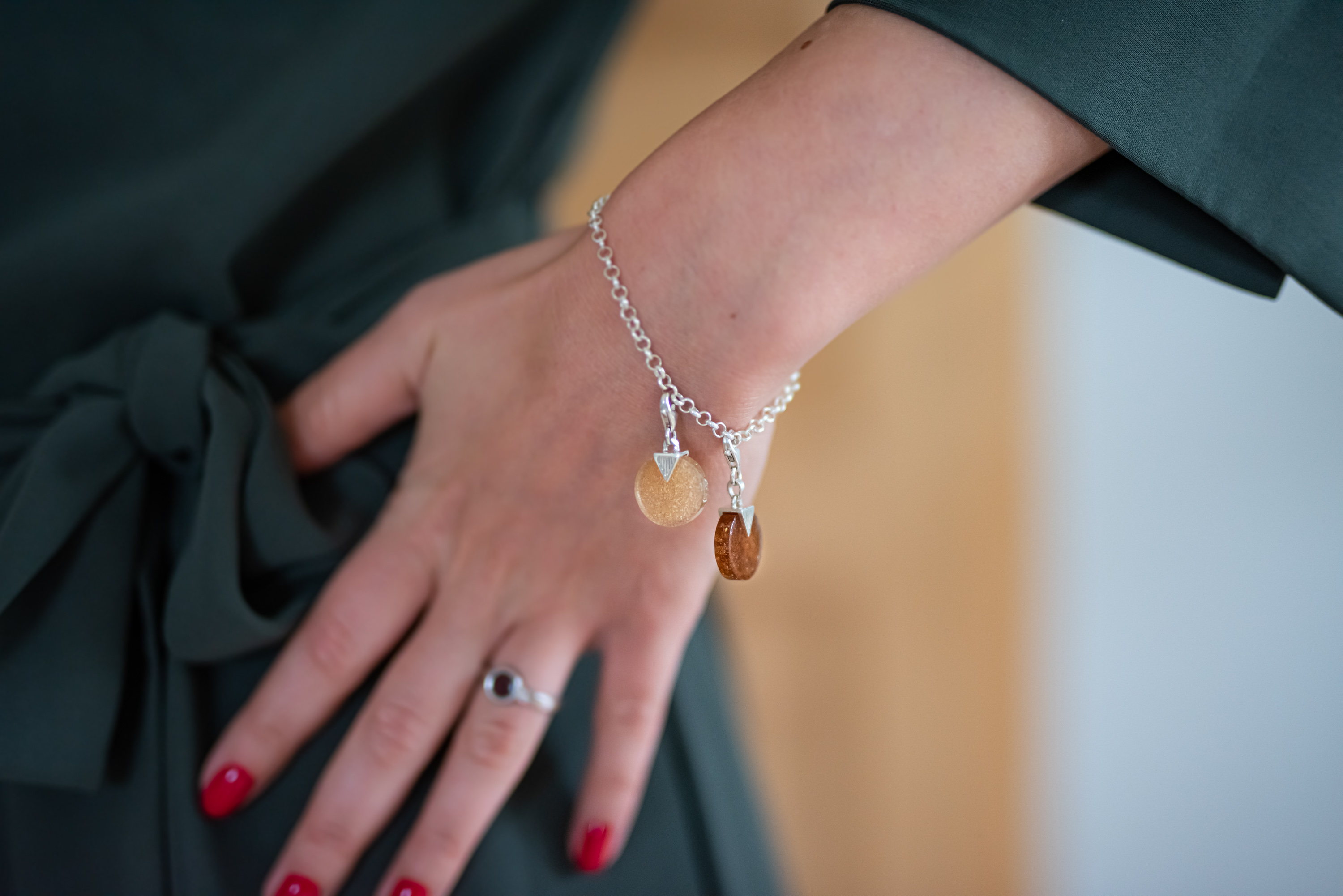 Ha esetleg különleges, egyedi darabra vágyunk, akkor az is lehetséges. Elhozhatod a kedvenc borod, vagy azt, amelyiket egy különleges alkalommal fogyasztottál és nem szeretnél róla megfeledkezni. “Idővel kialakult, hogy a márkánk a 3 V: vágy, várakozás és változás. Vágy, mert különleges álmot tudunk teljesíteni és erre vágyunk, hogy a szép emlékeket bezárjuk. Várakozás, mert, hogy 8-10 hét alatt készül el a termék, gondos kézműves munkával, és változás, mert nemcsak a fényben és a megjelenésében változik az ékszer, hanem természetes anyagnak leképezéseként azt a természetes öregedést, amit a bor a palackban is végrehajt hosszú időn át, az egyes medálok visszatükrözik nekünk. Saját borból is elkészítjük az ékszereket, mert így válik igazi emlékékszerré. Készítettünk már gyermek születésekor, 18 évvel ezelőtt palackozott borból ékszert, vagy utazásról hazahozott borból, esküvőn félretett borból vagy olyan borból, ami nagyon erős érzelmi töltetű és amellyel egy anya-lánya kapcsolatot foglaltunk kőbe.”
