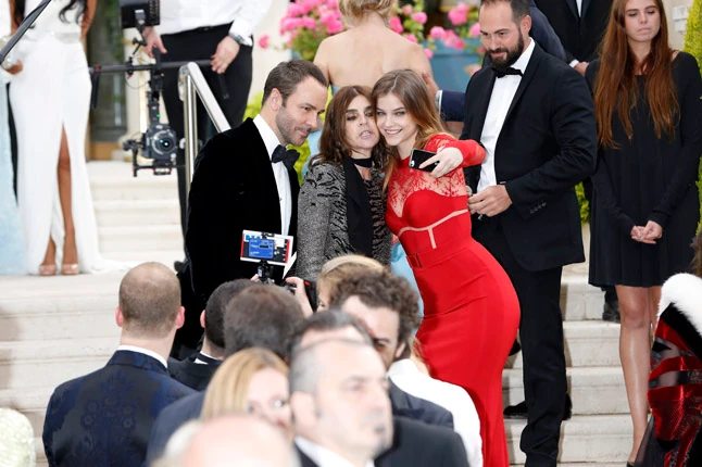 Palvin Barbara megint ragyogott, és ezúttal egy élénkebb színű, vörös ruhát választott a bevonuláshoz, ami igencsak látványos volt. Az igencsak felszabadultnak tűnő topmodell készségesen pózolt a fotósoknak, sőt még egy közös szelfizésre összeállt Tom Forddal és divatstylist, laptulajdonos Carine Roitfelddel.