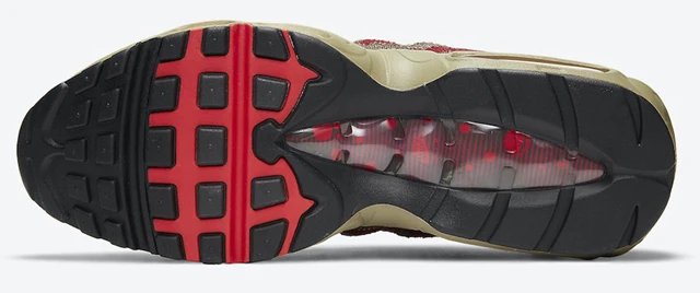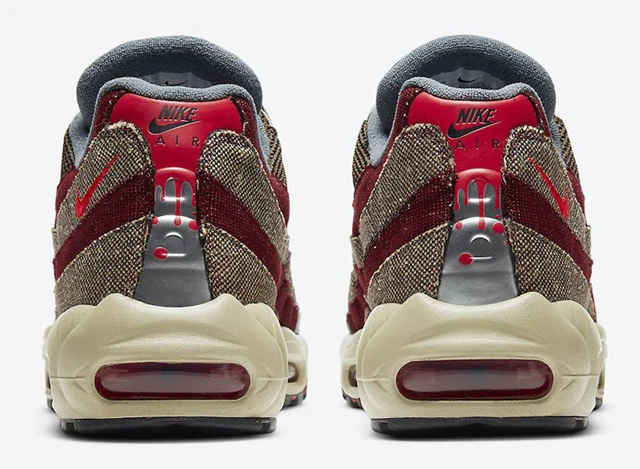 A mostani cipő feltehetően már a halloweeni készülődés terméke. Az Air Max 95 kidolgozása hibátlan. A színe kissé nagypapásan öreges hatást sejt, ugyanakkor olyan, a vörös részletek olyanok, mintha vérben tocsogott volna a viselője, a kis szakadás-varrás pedig nagyon pici, de tökéletesen a horrorklasszikushoz méltó részlet.
