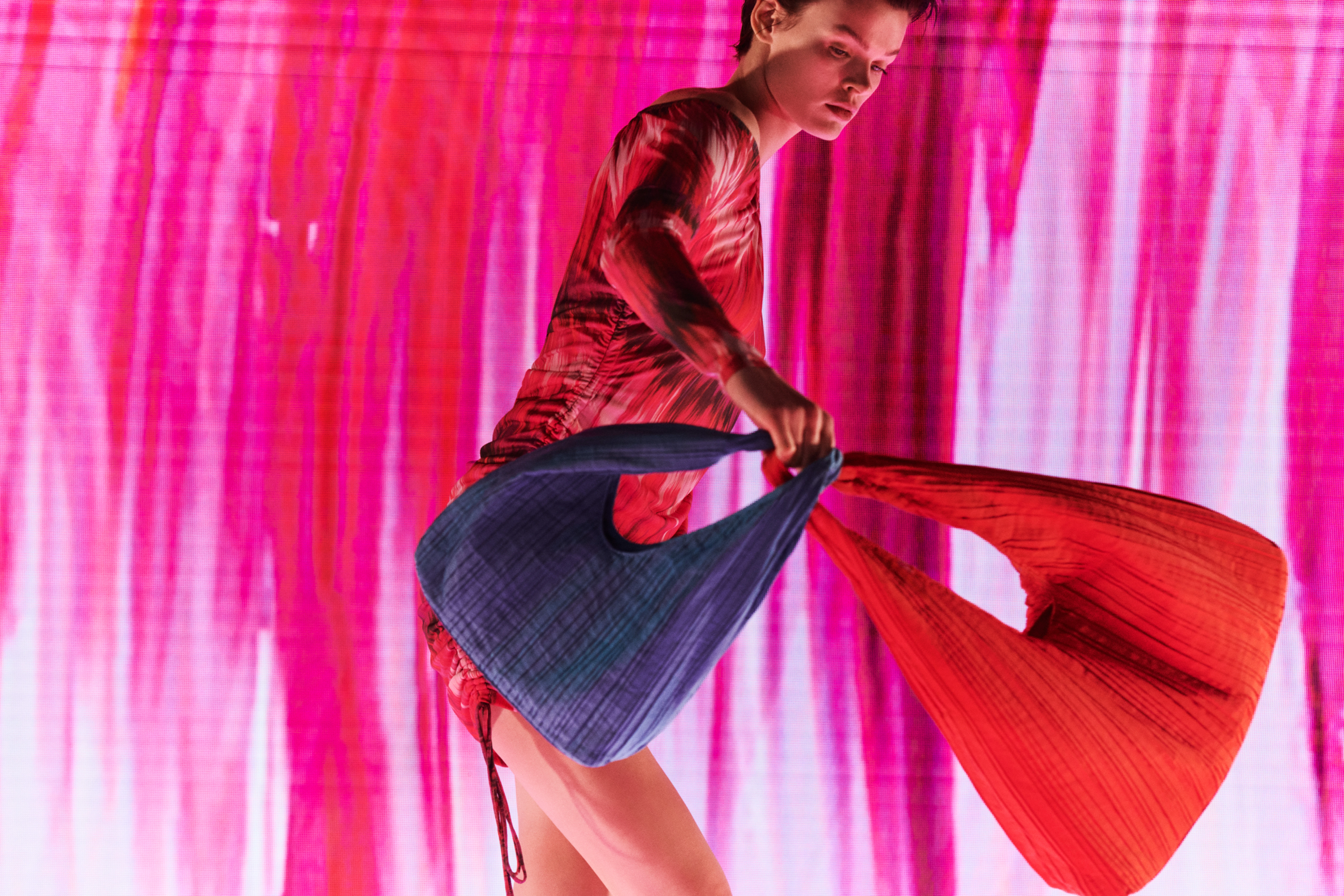 Az anyagok textúrája is nagy szerepet játszik: a vidám színeket ötvöző horgolástól kezdve az ezüstszállal szőtt ruhákon át, egészen a holografikus részletekig, amik egy ruha anyagát borító réteg formájában jelennek meg. Kötött részletek a puha műbőr mellett, szabályosan szedett, átlós csíkozású farmeranyag a kék kabát gyűrött anyaga mellett - az egész többdimenziós, változatos, de ugyanakkor koherens és következetes. Az anyagokat úgy válogatták össze, hogy akár a digitális térbe is képzelhetjük magunkat - a szürreális találkozik a kézzelfoghatóval, és csak a befogadóra van bízva, hogy melyik lehetőséget választja.