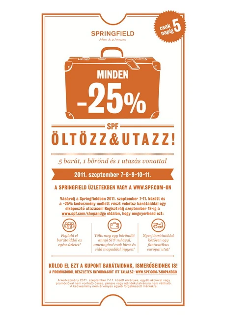 Te is álmodoztál már arról, hogy a szezon legjobb darabjait fizetés nélkül viszed magaddal egy üzletből? Mit szólnál, ha mindezt becsomagolhatnád egy bőröndbe és elvihetnéd egy európai álomutazásra? A Springfield "Öltözz&Utazz" akciójában mindez most lehetséges - szeptember 7-11-ig!
