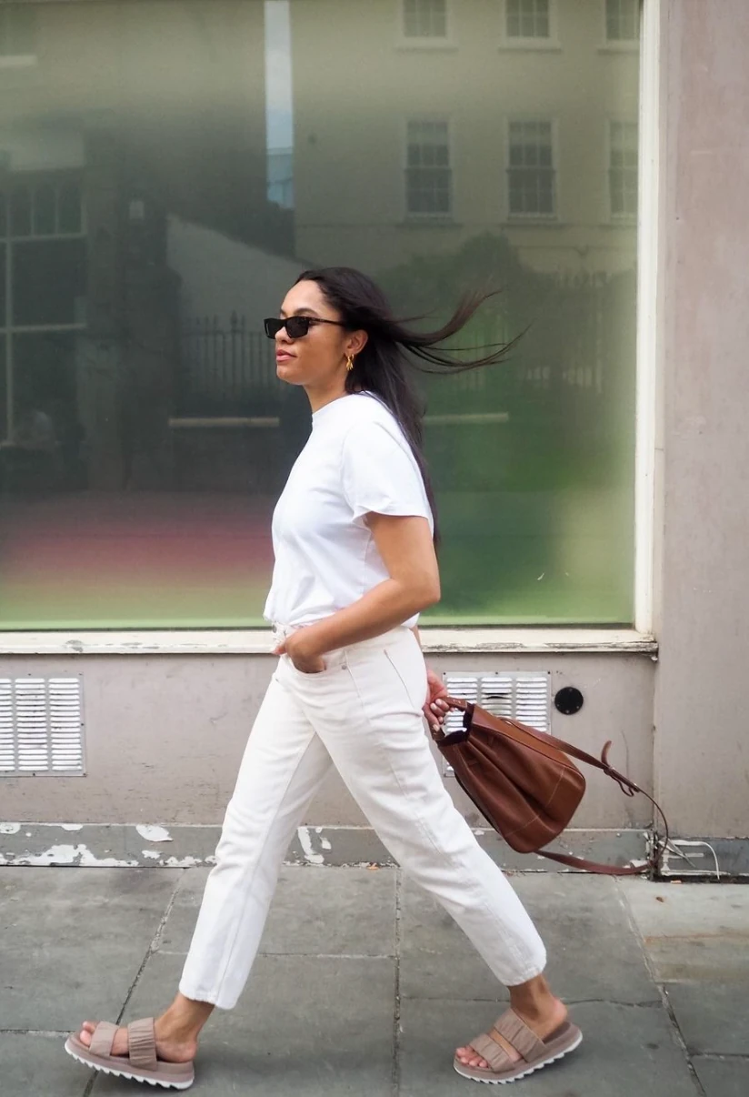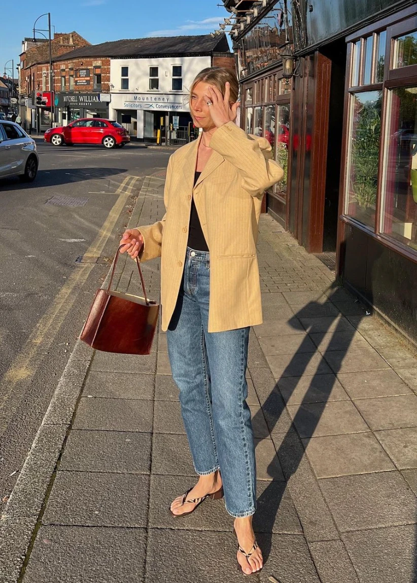 Íme egy tökéletes munkaidő utáni összeállítás. A vintage lenvászon blézer, válltáskával és alacsony sarkú papuccsal a legjobb választás lehet egy nyáresti vacsorához, természetesen egy igazán klasszikus egyenes szárú farmer társaságában.