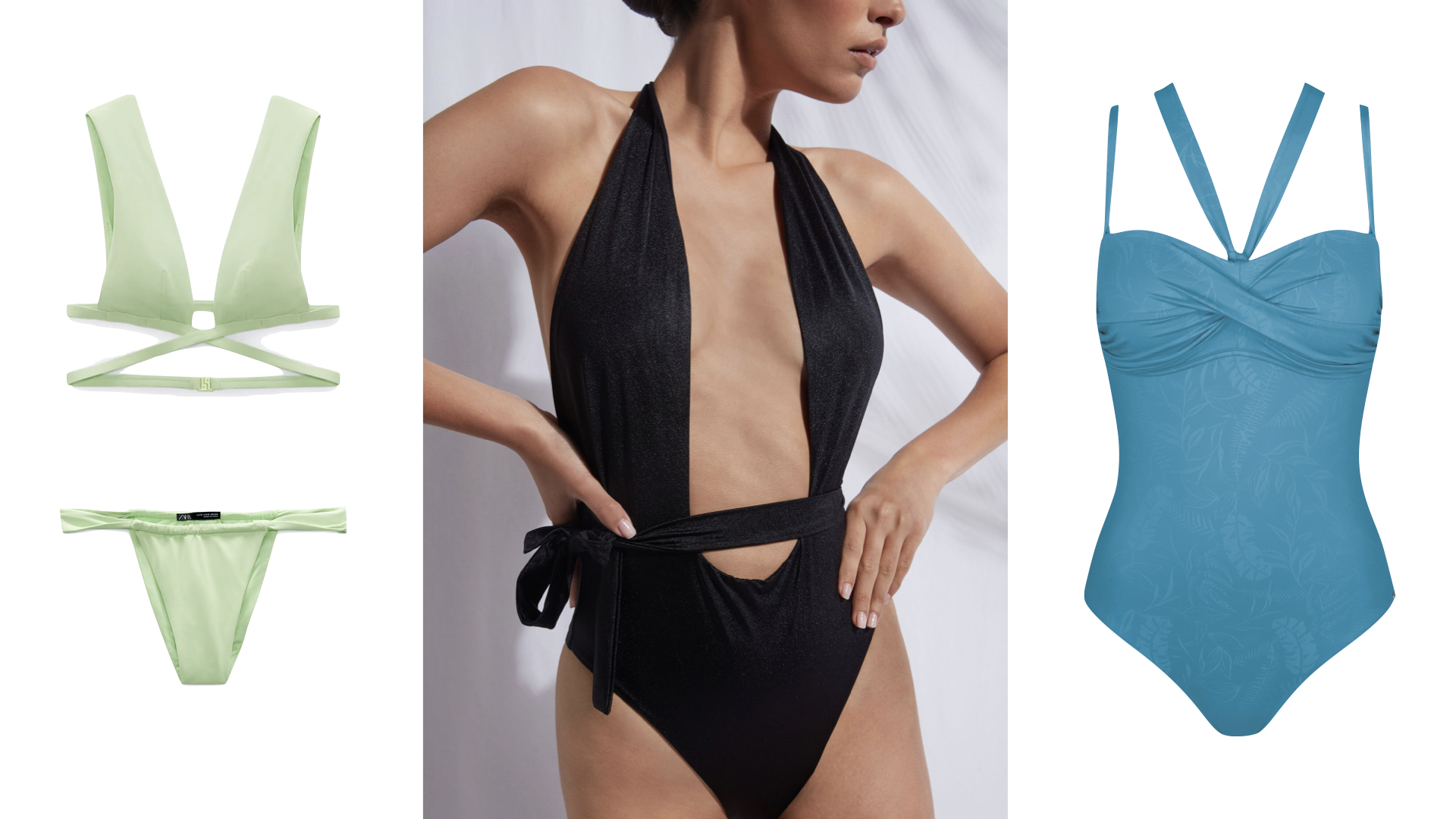 Bikinifelső- és alsó ZARA 5595 Ft, 4995 Ft; Fekete fürdőruha CALZEDONIA 21 000 Ft; Kék TRIUMPH 21 999 Ft