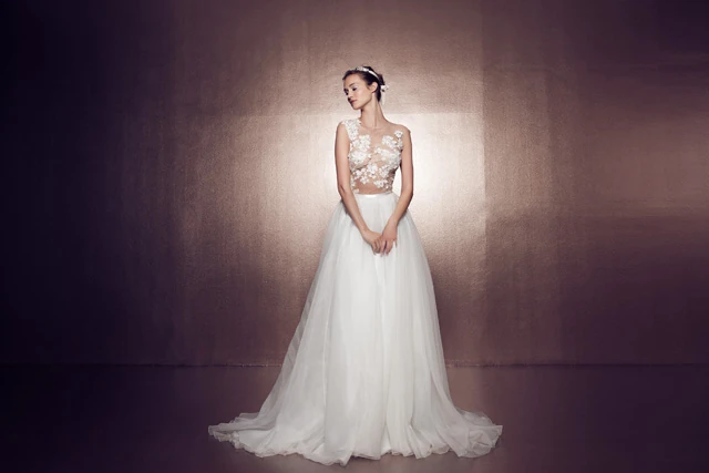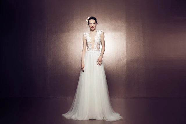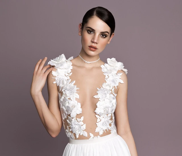 hátukat vagy a dekoltázsukat más, csupán csillogó kövek, csipkék és virágok. Ezeket a lehelet finom tüllből és csipkéből varrt megoldásokat hoztuk át a menyasszonyi és alkalmi ruhák világába, így különleges, meseszerű hatást varázsoltunk vele a Daalarna esküvői ruha kollekciójához" - Benes Anita.