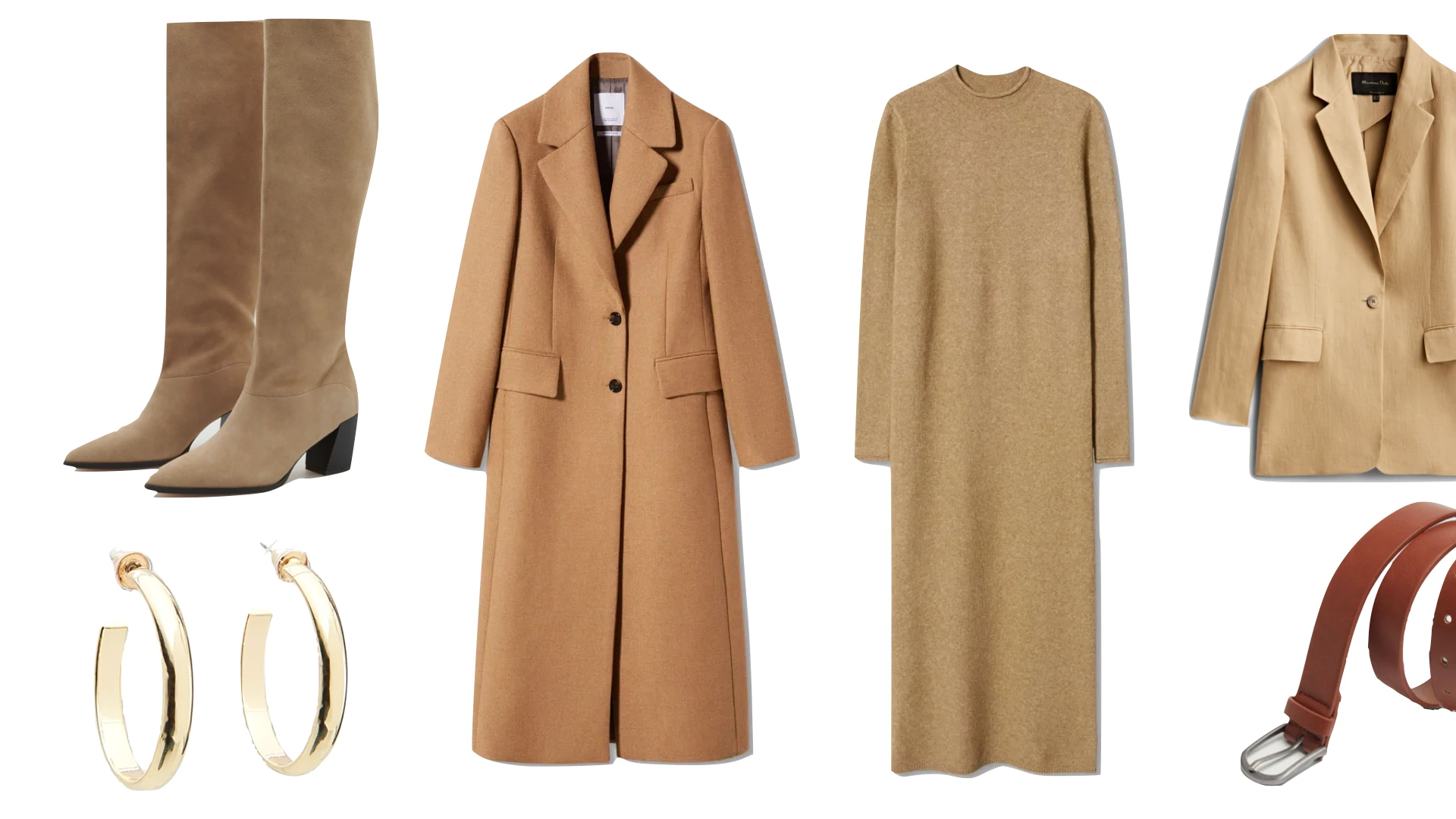 Csizma RESERVED 35995 Ft, fülbevaló RESERVED 2595 Ft, kabát MANGO 55995 Ft, ruha MANGO 9995 Ft, zakó MASSIMO DUTTI 65995 Ft, öv PARFOIS 4995 Ft
