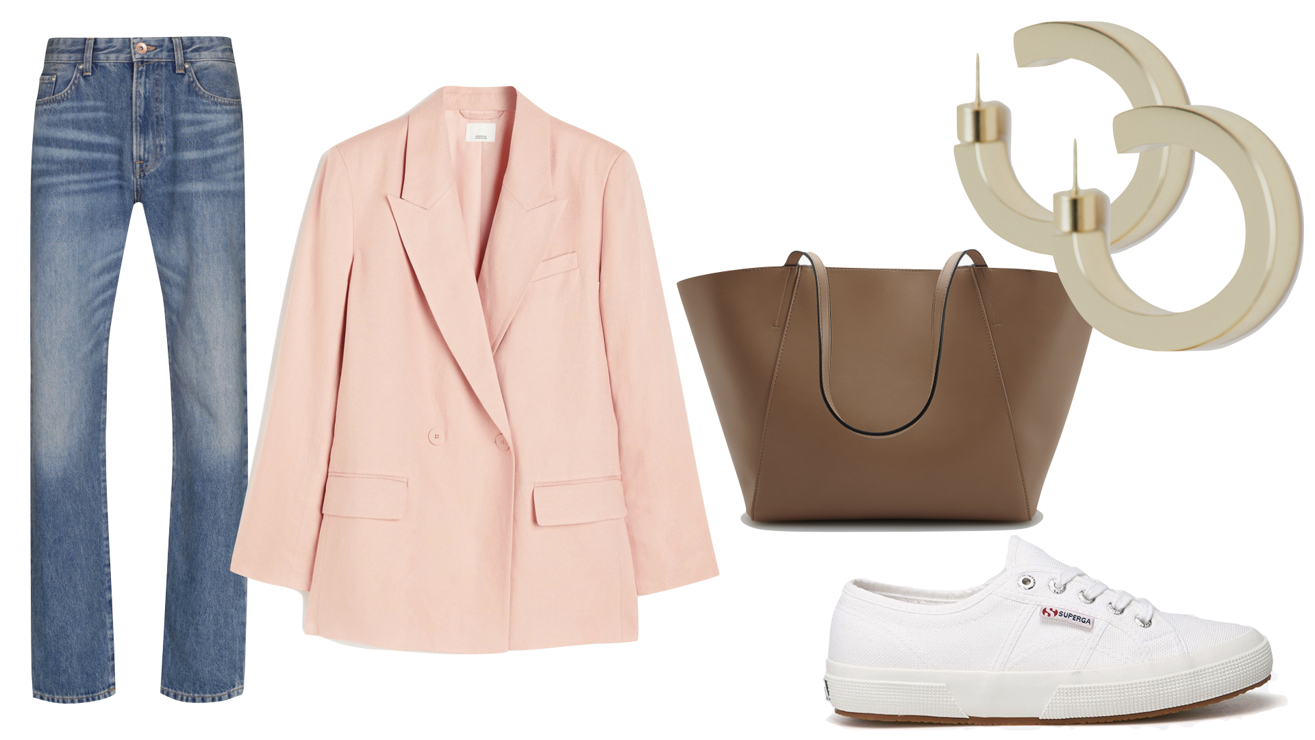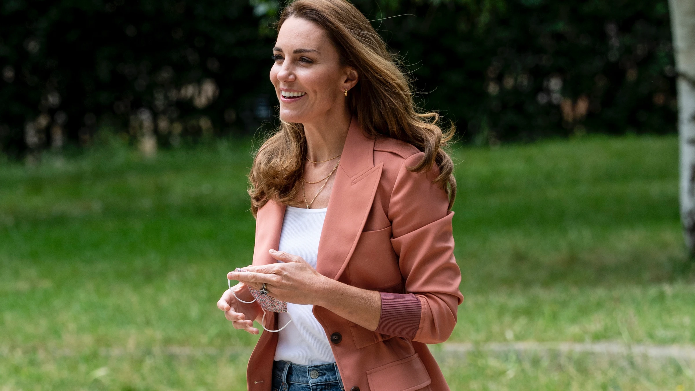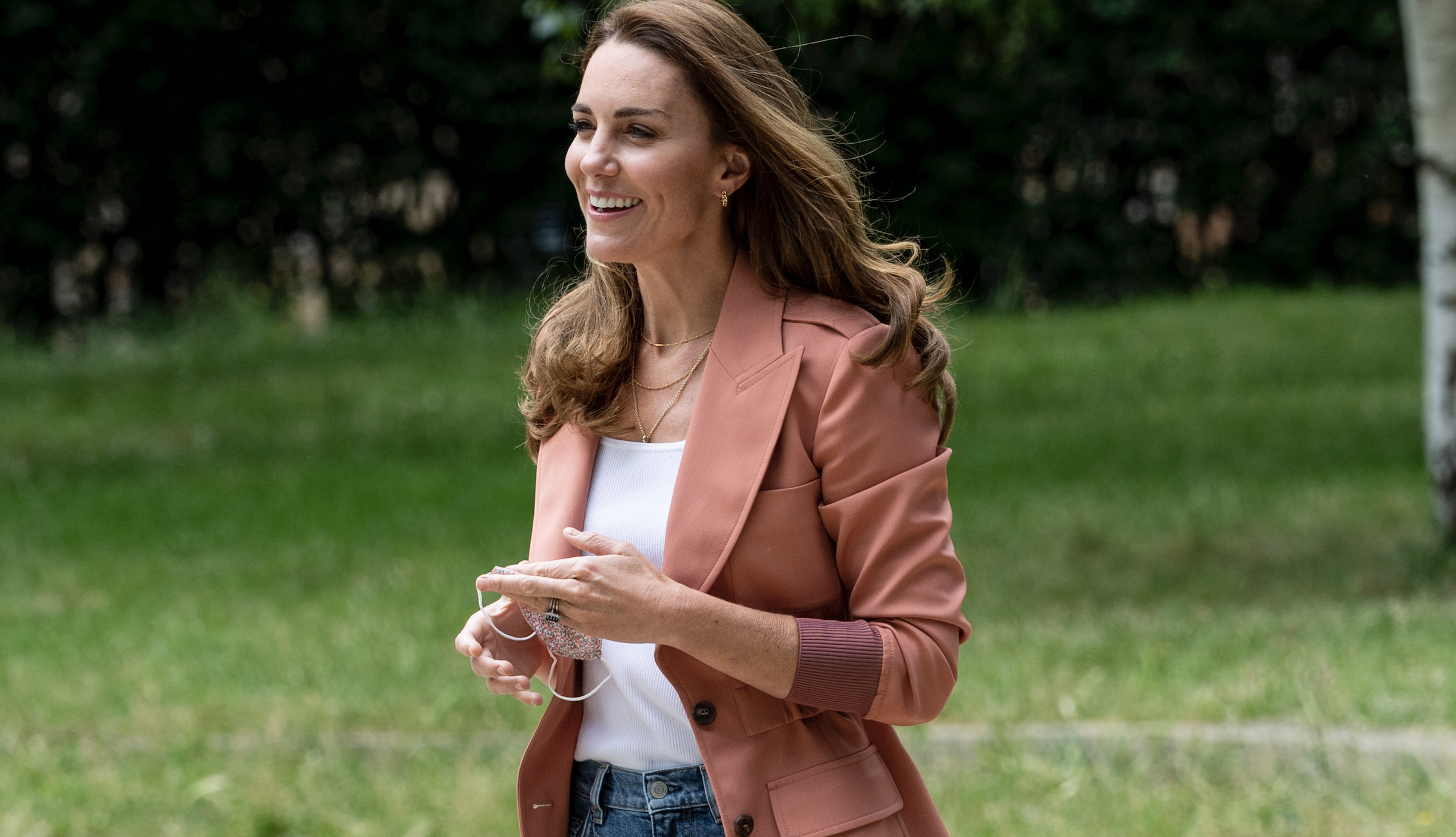 A sportos farmer is kap egy kifinomultabb megjelenést, amint egy zakóval párosítják. Ezt a darabot a hercegné egy pólóra rétegezte, majd sportcipővel koronázta meg. A hétköznapok hibátlan összeállítása látható itt.