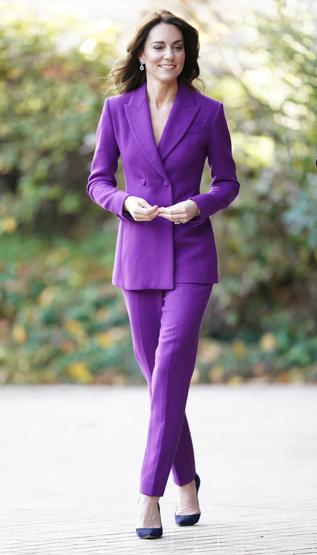 Szintén egy friss megjelenés ez a lila kosztüm, és ami még merészebb, az az, hogy Katalin hercegné csupán egy zakót visel felül. Ez persze nem egy új trend, de a királyi család tagjai között korántsem elterjedt. Pedig a zakó mint felső nagyon jól működik.