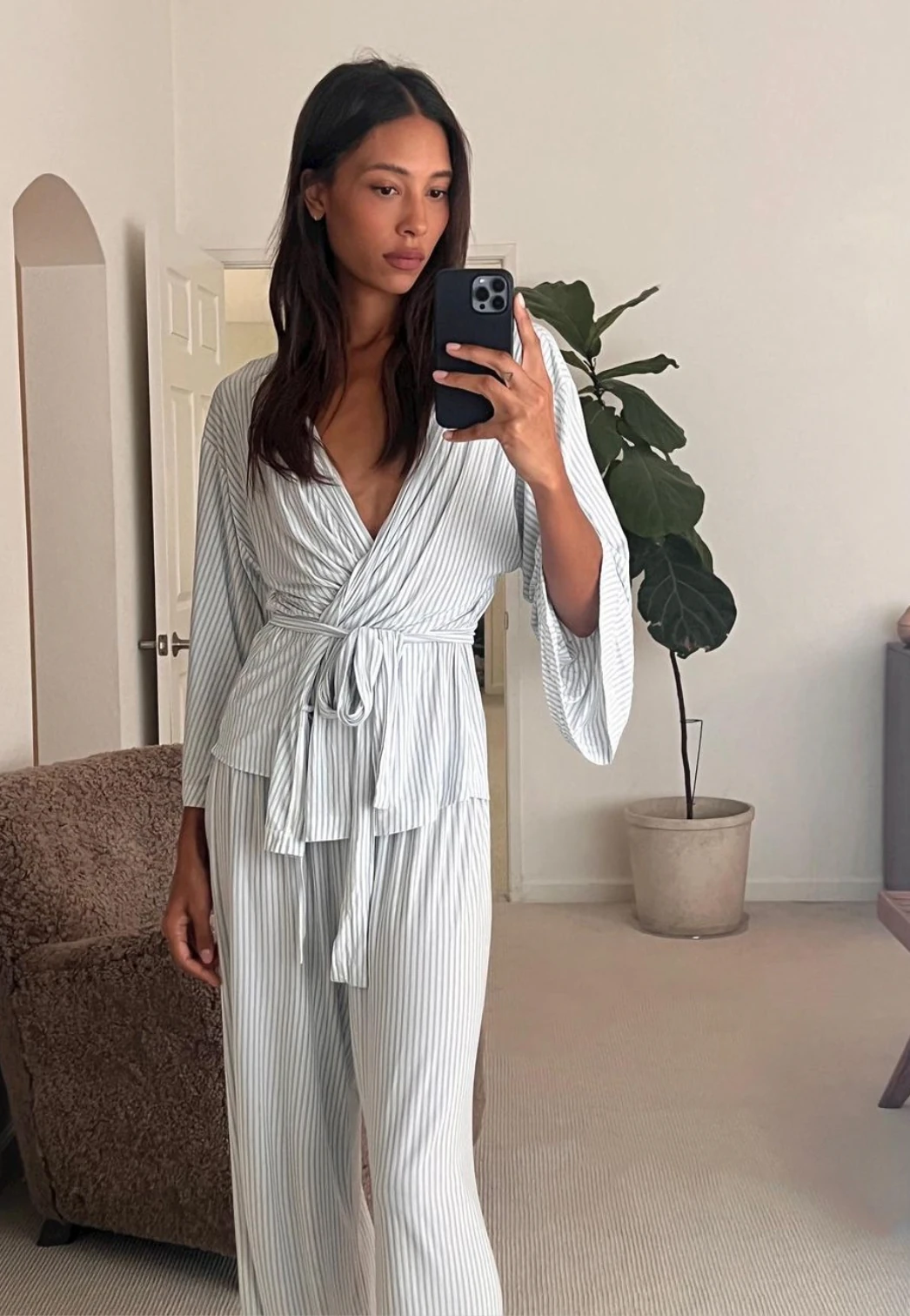 A népszerű influenszer, Jessica Skye rendszeresen megjelenik a Who What Wear honlapján stílusos outfittjeiben. Tökéletes inspiráció lehet minden megjelenése. De most jöjjön egy pizsama nadrágos szett, ami az otthon kényelmét tükrözi, ám az utcán jelenik meg. Ugye, hogy működik?