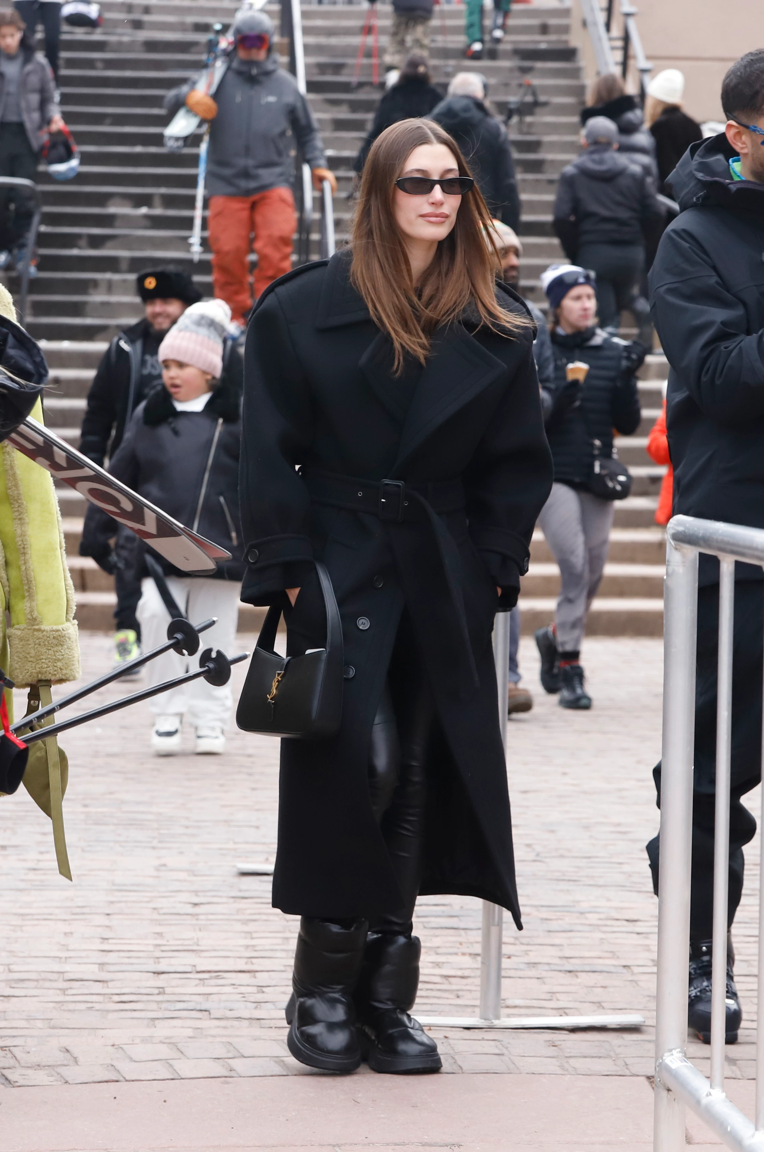 Kétségtelen, hogy az oversize télikabátok valaha volt legnagyobb rajongója Hailey Bieber, és erről a sípályák közelében sem mondott le. Alapvető darabját bőrhatású Loewe leggings és hótaposó egészítette ki. Mi sem természetesebb, hogy kedvenc Saint Laurent kiegészítőivel emelte tovább a szett eleganciáját, ami egészen meglepő, de szerintünk követendő példát mutat a hütte trendekben.