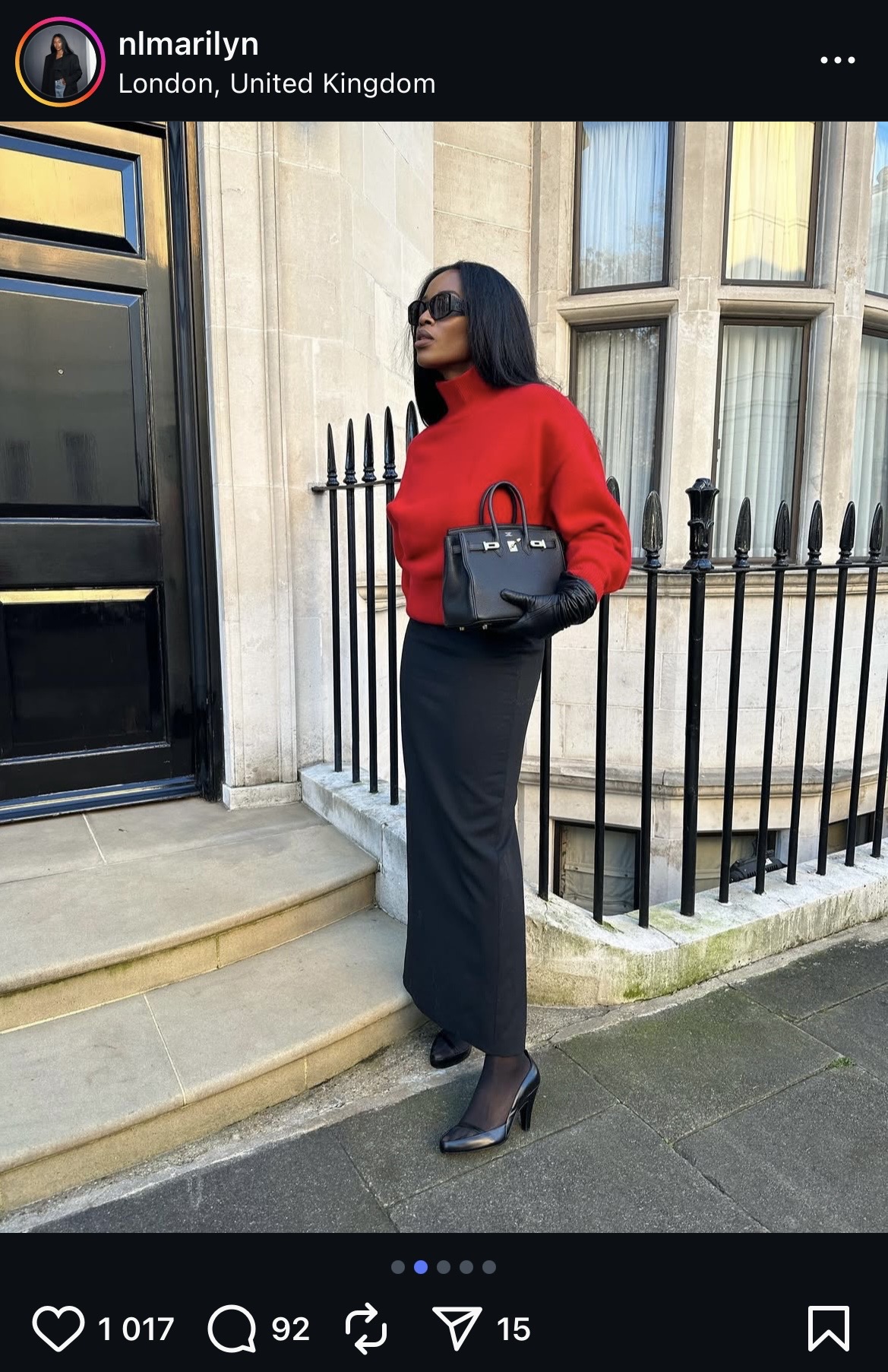 A piros pulóver és a maxiszoknya közös erővel bizonyítják, hogy a klasszikusok sosem mennek ki a divatból, és mindig a legjobb választást jelentik