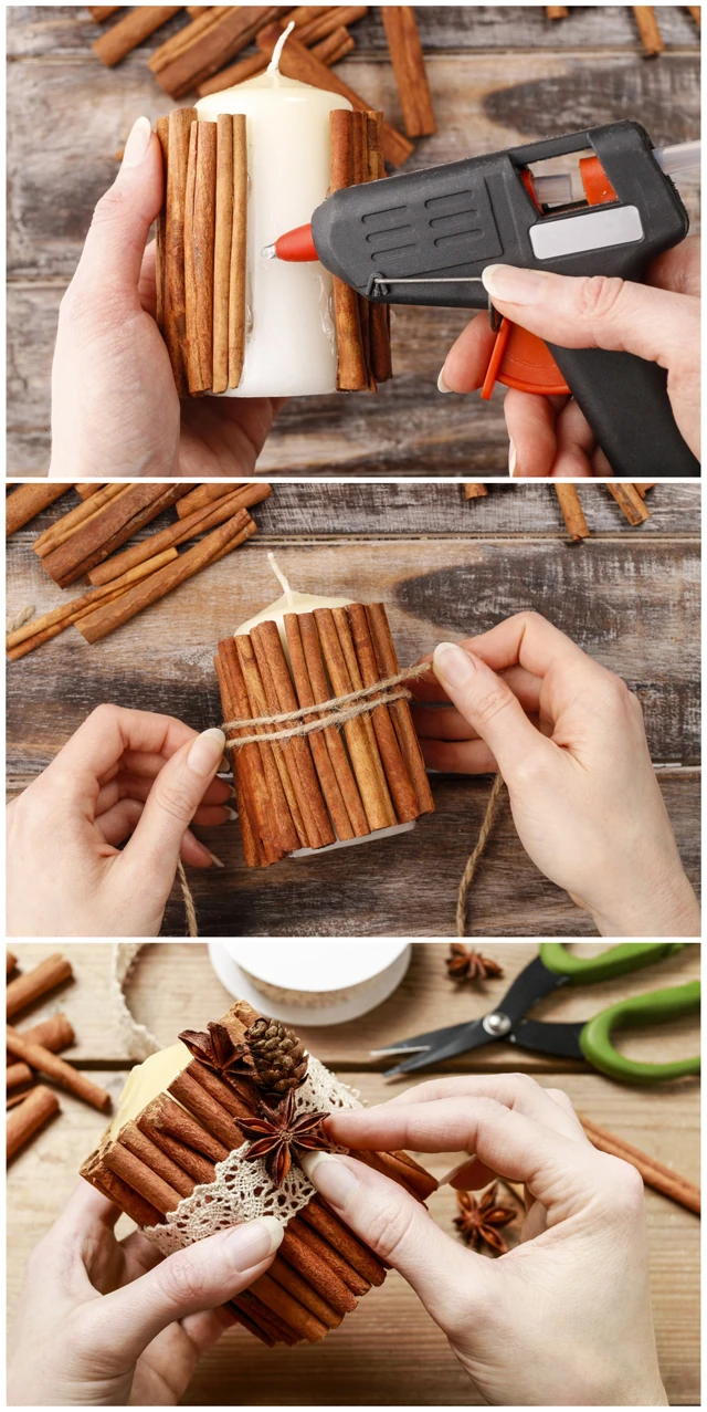 Ragaszd a fahéjrudakat egy ragasztópisztoly segítségével a gyertyádra, majd kösd át kedvenc szalagoddal, vagy csipkéddel, amit lezárásképpen szintén ragasztóval erősíts meg.