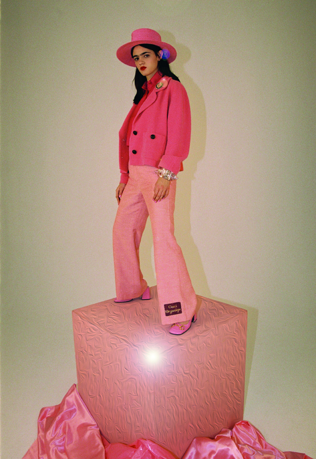 Blézer, ing, nadrág, kitűző, karkötő, kalap és cipő GUCCI