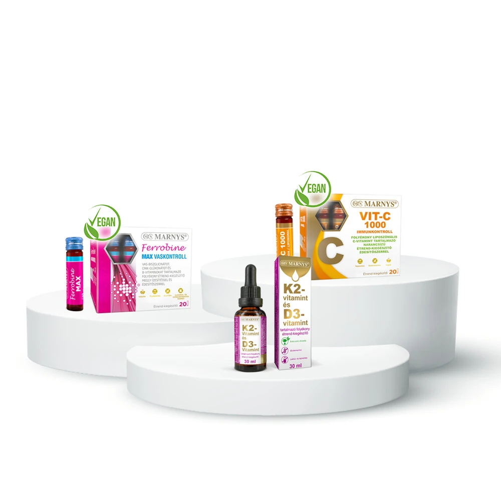 Jó hír, hogy nem kell többé külön beszerezni őket, köszönhetően a Marnys Vas + C + K2-D3 vitamincsomagjának! A csomag tartalmaz 1 darab Marnys K2-vitamin- és D3-vitamin tartalmú, pipettás adagolású, 1 darab vas tartalmú folyékony, valamint 1 darab C-vitamin tartalmú folyékony étrend-kiegészítőt is. Így könnyedén gondoskodhatunk szervezetünk teljes körű támogatásáról.