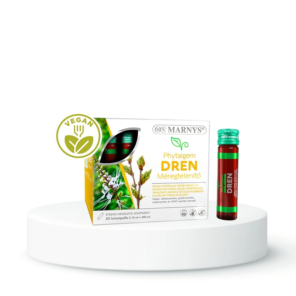 A Marnys Phytalgem DREN teákból és növényi rügyekből készült sűrítményeket tartalmazó, ananászízű folyékony étrend-kiegészítő. Az étrend-kiegészítőben található fiatal borókahajtás és nyírfarügy, a fizikai test szintjén összetett ásványi anyag- és nyomelempótlóként funkcionál.