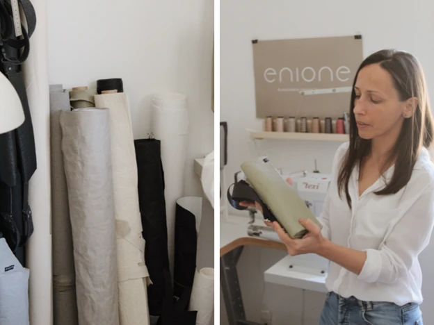 Az enione márka csak 2023 januárjában indult útjára, Enikő azonban ennél sokkal régebben foglalkozik tervezéssel, varrással és az alapanyagok terén is régóta foglalkoztatja a fenntarthatóság. Korábban használt vitorlavászonból és kidobásra szánt katonai ponyvákból, zsákokból varrt táskákat, ma már az anaszászbőrt és kraftpapírt cserélgeti a varrógép alatt.
