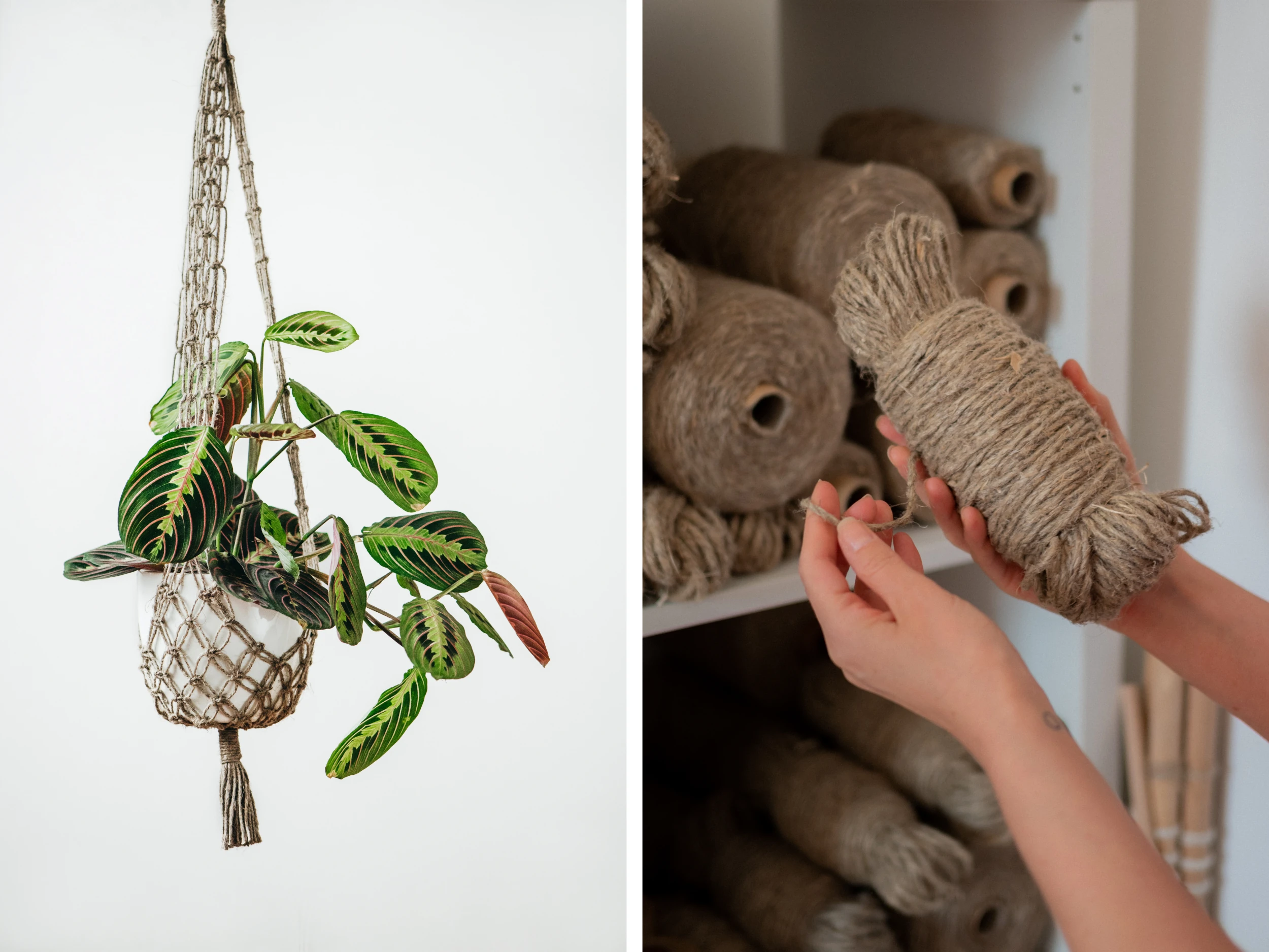 „A kenderfonal, amit használok teljes mértékben magyar alapanyag, itthon termesztik és dolgozzák fel. Szeretem a kenderfonal változékonyságát, hogy hol vastagabb, hol vékonyabb, ettől lesz egy ebből készített makramé egyedi. A fonál használat közben sokat változik. Kezdetben durvább matéria, picit szöszöl, de ahogy elkezdünk dolgozni vele szépen megpuhul. Ráadásul a kenderfonal útja is csodálatos. Tudom, hogy honnan érkezik, nálam megmunkálásra kerül, de a workshopokon is van, hogy ezzel dolgozunk, majd a lehulló szálakat, amiket már nem tudok tovább felhasználni, eljuttatom oda, ahol még tudják. Volt, hogy micélium növesztéséhez adtam tovább, vagy egy keramikus barátnőm kísérletezett vele, és égette bele a kerámiákba” - mesélte Anikó, aki akár komposztálhatná is a megmaradt kenderszálakat, mivel teljesen természetes, lebomló anyaggal dolgozik.