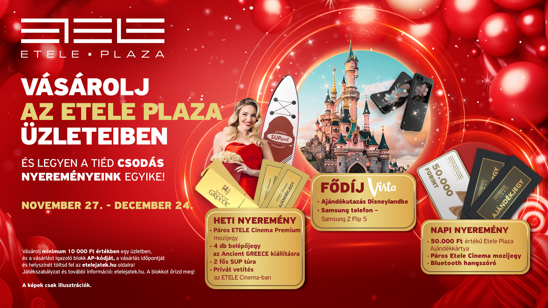 A napi nyeremények – 50.000 Ft-os vásárlási utalvány, vagy páros Comfort ETELE Cinema mozijegy, vagy Bluetooth hangszóró – mellett hetente kisorsolnak egy páros belépőt az ókori Görögországot bemutató nagyszabású kiállításra, egy kétszemélyes SUP túrát, vagy a 4 privát vetítés egyikét az ETELE Cinema-ba. Ráadásul nem csak egy, hanem rögtön két fődíj is gazdára vár: a szerencsés nyertesek egy Disneyland-i álomutazással vagy egy Samsung Galaxy Z Flip 5 okostelefonnal lesznek gazdagabbak.