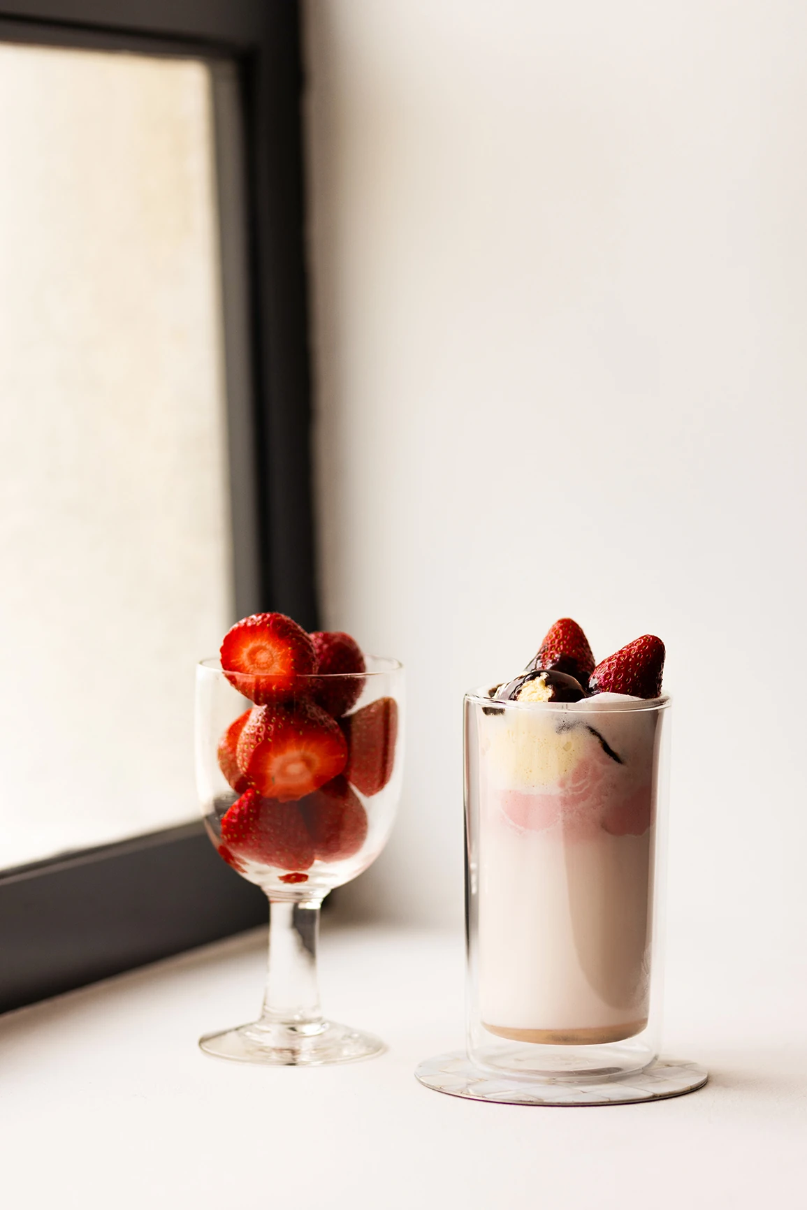 Először rakd a szamóca fagylaltot egy pohárba. Ezután add hozzá vanília szirupot. Helyezd a poharat a kifolyó alá, és készíts „hideg tejet”. Tetejére adagolj egy gombóc vanília fagylaltot. Végül díszítsd friss eperrel és csokoládé öntettel.