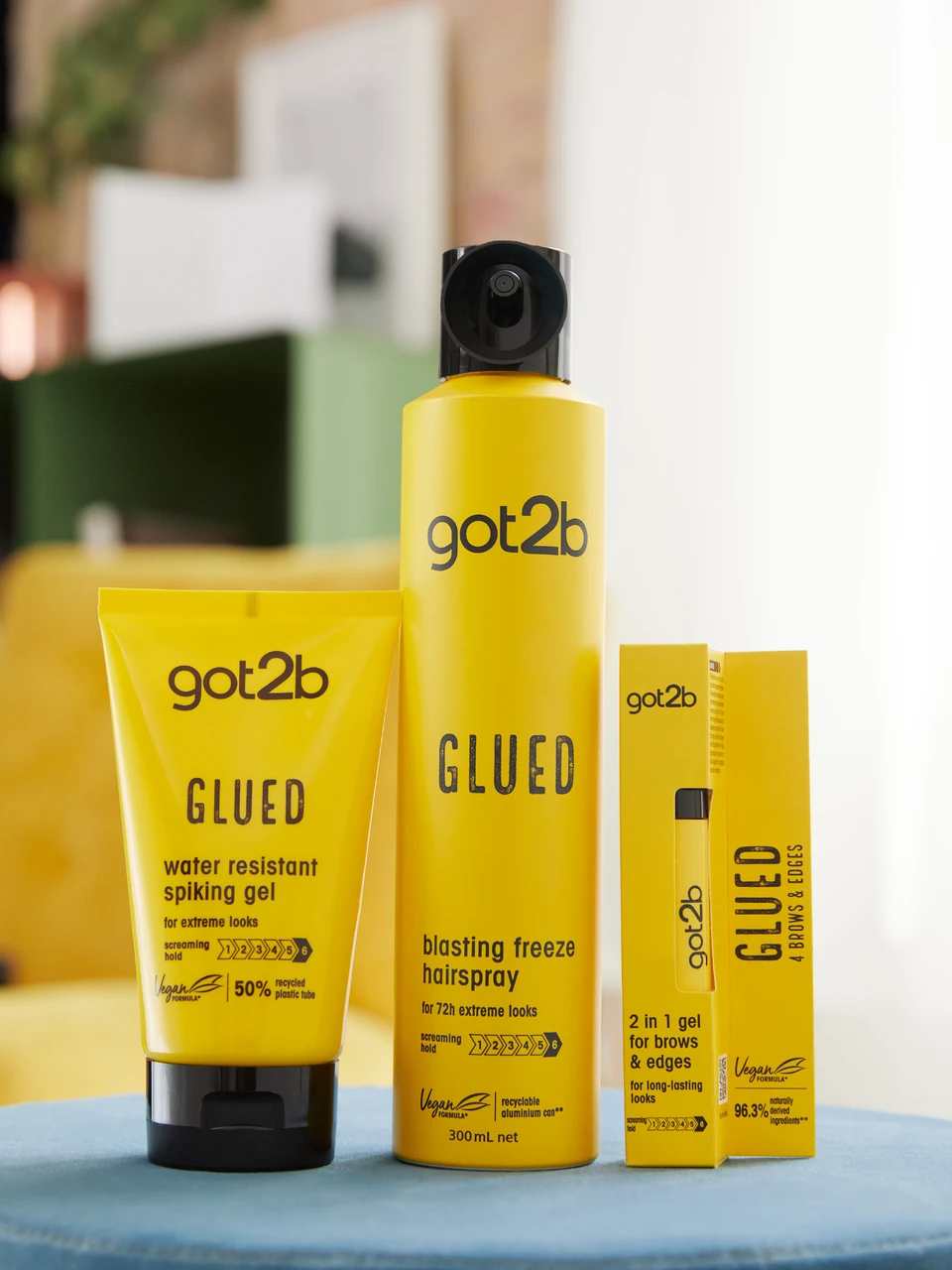 - A füleinktől indulva válasszuk ketté a hajtömegünket, majd a felső részt egy tupír fésű vagy egy kontykefe segítségével fésüljük egy copfba és rögzítsük egy hajgumival. Ehhez használjuk a Got2b Glued Tüskés ragasztó zselét, ami ultra erős fixálást biztosít a makacs hajszálainknak a következő hajmosásig. Nyomjunk kis mennyiséget a tenyerünkbe, dörzsöljük szét, majd oszlassuk el egyenletesen a hajon. Ez a hajzselé vízálló is, így esős, párás időben sem kell aggódnunk, hogy tönkre menne a frizuránk.