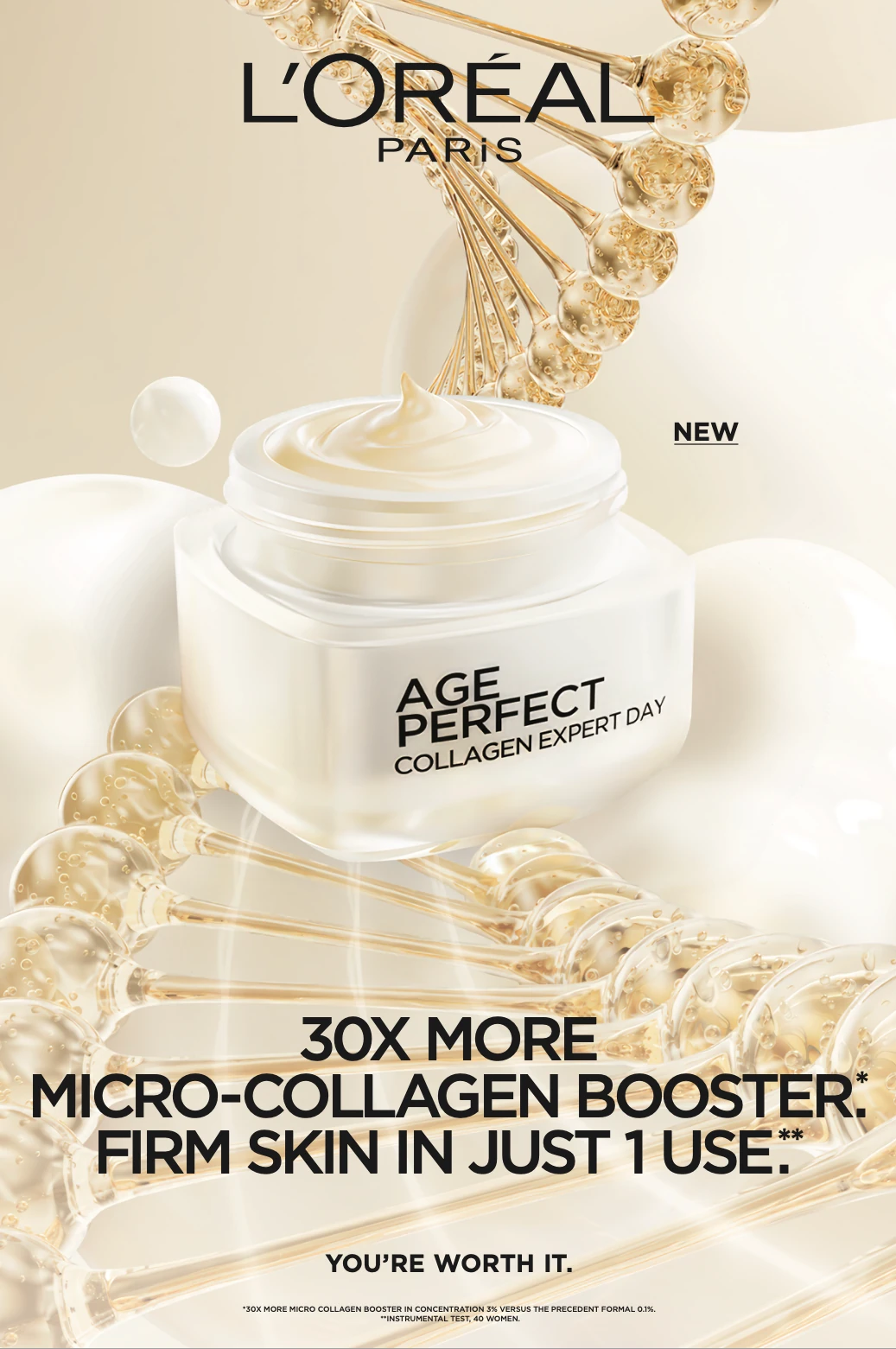 Az Age Perfect Collagen Expert nappali arckrém mikrokollagén-peptideket tartalmazó, korszerű formulával készült, amelyet az érett bőr feszességének és rugalmasságának támogatására fejlesztettek ki. A megújított összetétel a korábbi változathoz képest harmincszor nagyobb mennyiségben tartalmaz kollagénserkentő hatóanyagot**, így segíti a bőrt abban, hogy feltöltöttebb és feszesebb hatást mutasson akár már az első használat után*.