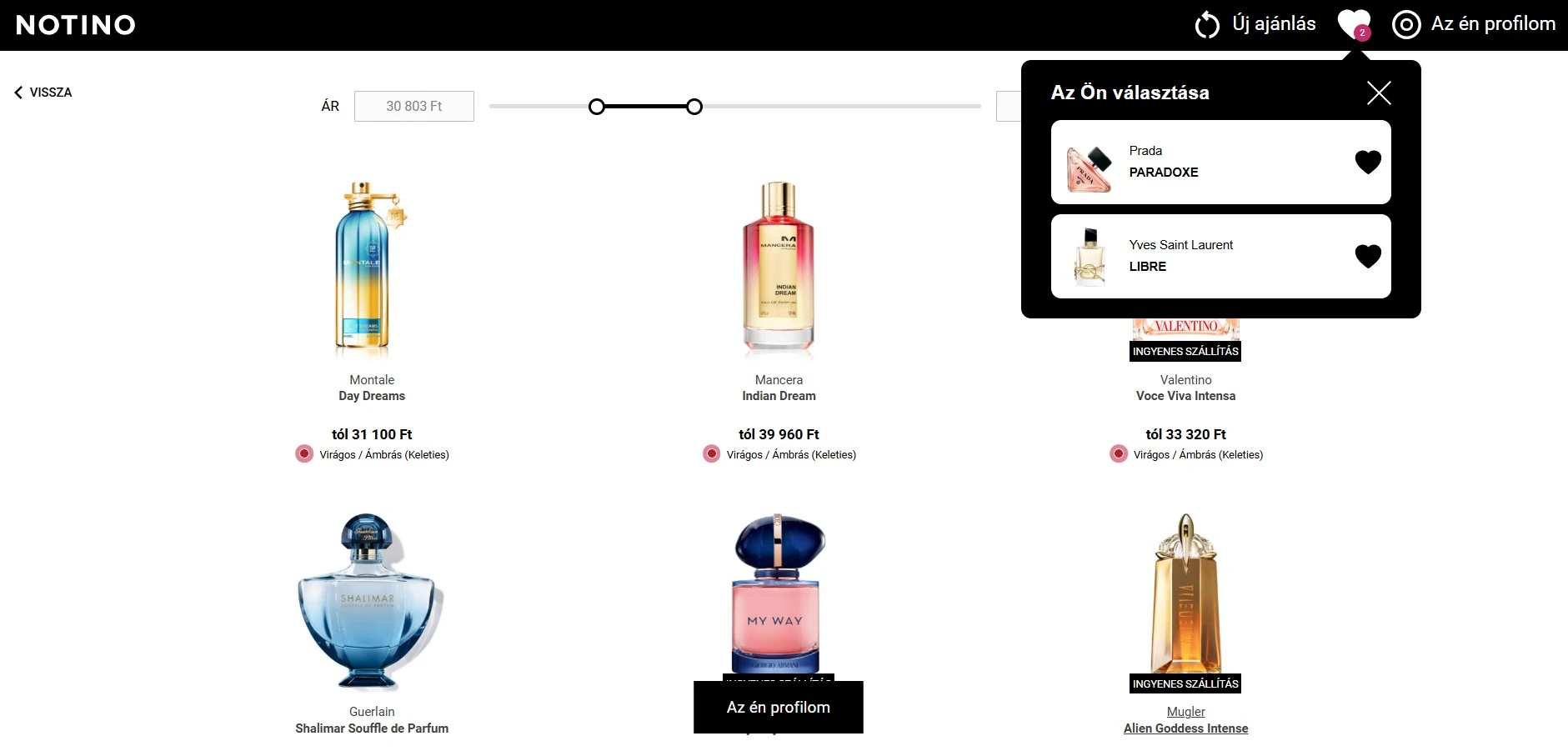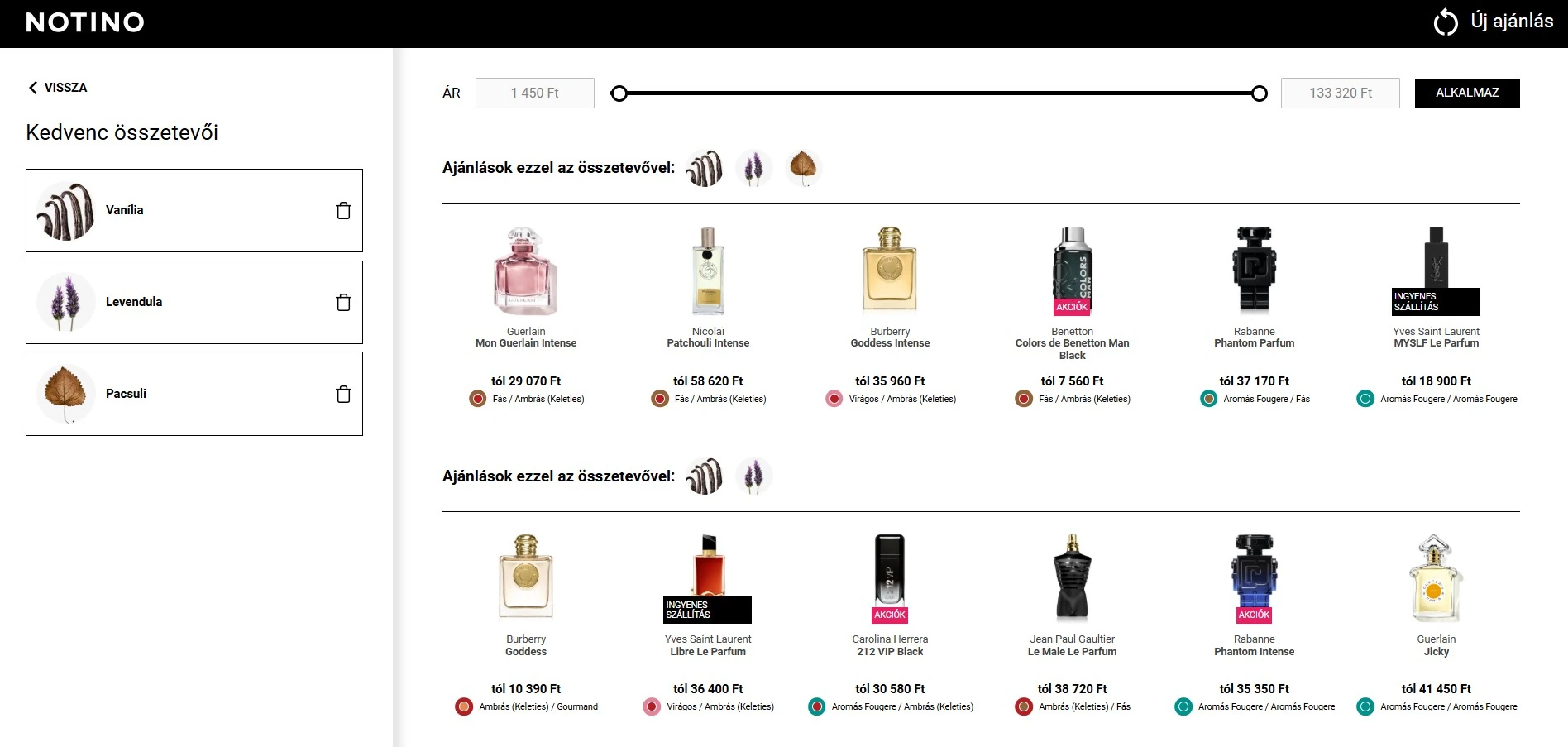 Ajándékválasztás szempontjából talán a legkönnyebb a dolgod, ha valami hasonló tulajdonságokkal rendelkező illatban gondolkozol, mint a megajándékozottad előző kedvence. Így biztosra mehetsz, hogy a parfüm passzolni fog a személyiségéhez és a bőrével is harmonizál majd. Itt ugyanúgy adott a lehetőség minimális és maximális ár beállítására, a rendszer pedig ennek megfelelően mutatja a legjobb találatokat: