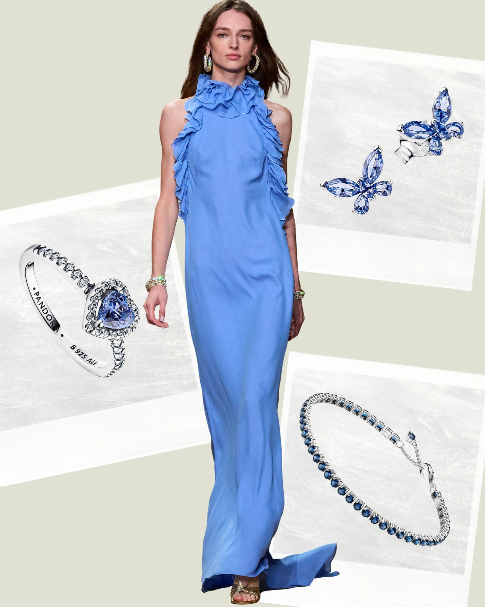 Az ezüst és a jégkék találkozása mindig tökéletes párost alkot. Friss, kristályos és könnyed. A karikafülbevalók vagy charmok fagyos ragyogása még éteribbé teszi a halványkék selymet, de ugyanolyan jól működik fehér, puha kötött darabokkal. Ez a páros a „tiszta glamour” téli verziója, szabálytalanul elegáns, és éteri.