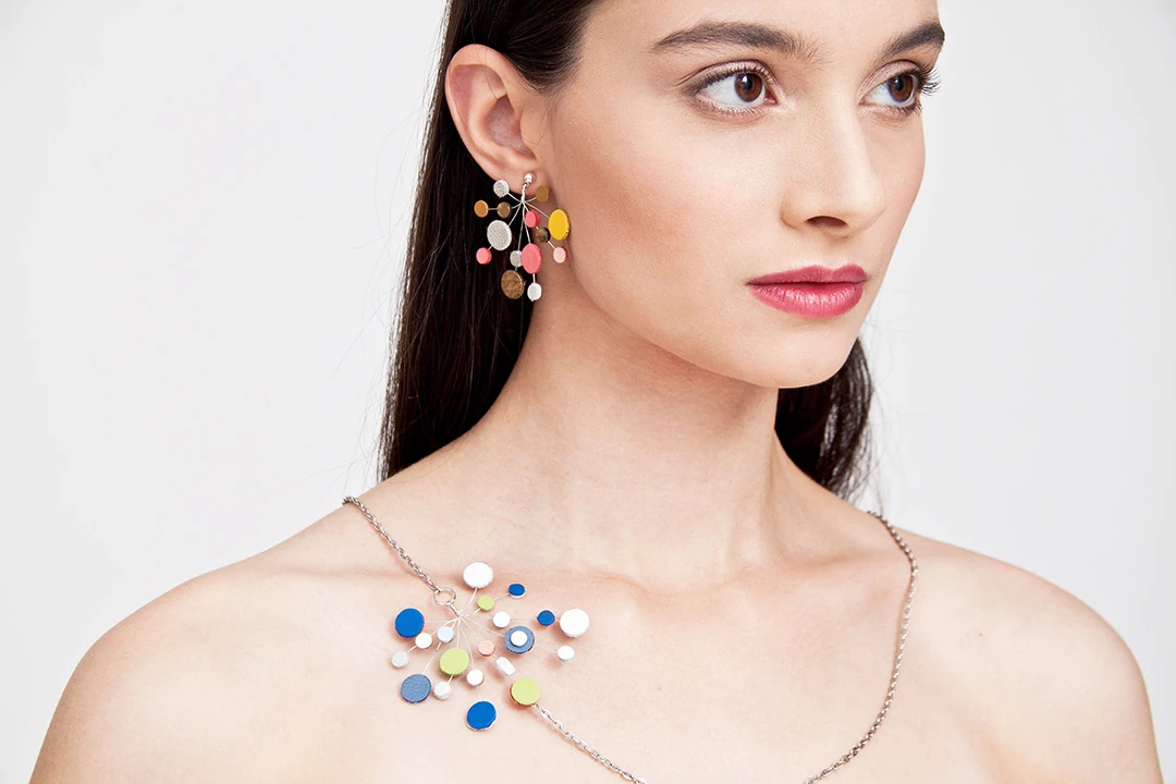 “Rájöttem, hogy szeretnék egy olyan fülbevalót készíteni (nekem ez a legkedvesebb kiegészítőm a világon), mely tükrözi a viselője személyiségét: színtípusra szabható, látványos, mégis légies, vagány, egyedi. A bőr szeretete adott volt számomra, és egy hajnalban megálmodtam a PEARLY-t, ami azóta külön életre kelt, és mára nem csak fülbevaló, de karkötő, nyaklánc, cipőklipsz, de akár hajpánt, vagy gyűrű is elkészíthető a technikájával.” - Mesélte Juci.