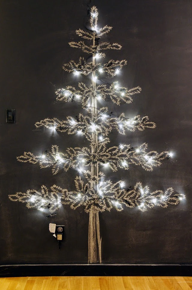 Ha a te lakásodban is van egy fal, amire lehet krétával rajzolni, akkor használd ki, és idén álljon ott a karácsonyfa. Krétával felfestesz egy fát, és díszítsd majd égősorral. Ugye milyen egyszerű és ötletes?