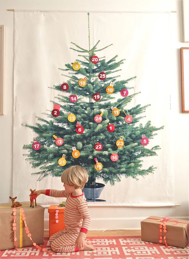 Akár adventi kalendáriumként is megállja a helyét ez a szuper dekoráció. Az Ikeában is lehet kapni ilyen nagyméretű vászonfotót fenyőfáról, amit úgy tehetsz még különlegesebbé, ha kis zsebeket varrsz fel rá, amibe elrejthetsz minden napra karácsonyig egy-egy apróságot. De kis vászondíszeket is felapplikálhatsz rá, és akkor karácsonyfaként is tökéletesen megállja a helyét.