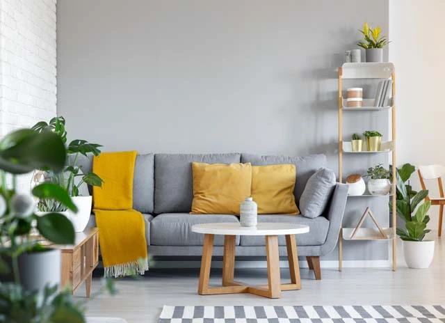 Ha igazán szeretjük a színpárt, kombinálhatjuk őket textíliákban is. Akár szürke-sárga díszpárnákat tehetünk a kanapénkra, vagy a függönyben is megjeleníthetjük.