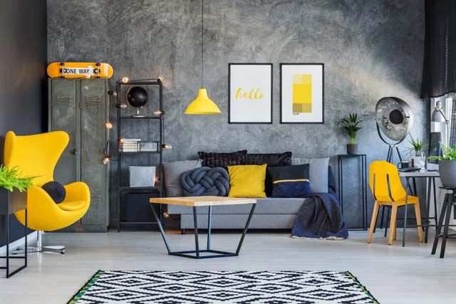 A szürke szín hallatán lakberendezés terén egyből a beton jut eszünkbe, melyekhez tökéletesen passzolnak az élénk színek, így a sárga is. A két szín találkozása a parkolóházak alagsorára emlékeztet, ezért egy nagyon indusztriális, gyári stílust képezhetünk vele.