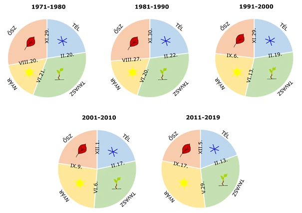 Az alábbi ábrán az egyes évszakok hosszának és kezdetének változásai láthatóak. A legtöbb területen egyedül tehát csak a nyarak lettek hosszabbak (évtizedenként akár 6–8 nappal), a többi évszak rövidebb időre korlátozódott. A tavasz és a nyár kezdete korábbra tolódott, a tél és az ősz esetén viszont éppen ellentétes a tendencia: 2–4 nappal később köszöntenek be az eddig megszokotthoz képest.