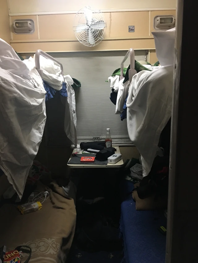Hiánytermék. Azt hiszem a sosem mosott takarók miatti éjszakai krákogást szívesen hanyagoltam volna a portól. A kocsik mérsékelten tiszták, a 70-es évekbeli magyar vagonokra emlékeztetnek, a klasszik acél wc-vel együtt, amelyre nem jutott takarító, az ember inkább kevesebbet evett-ivott, csak hogy ne kelljen visszajárnia. Tusolási lehetőség csak az első osztályon van, nekünk az otthonról hozott babakendő maradt. Hat napig.