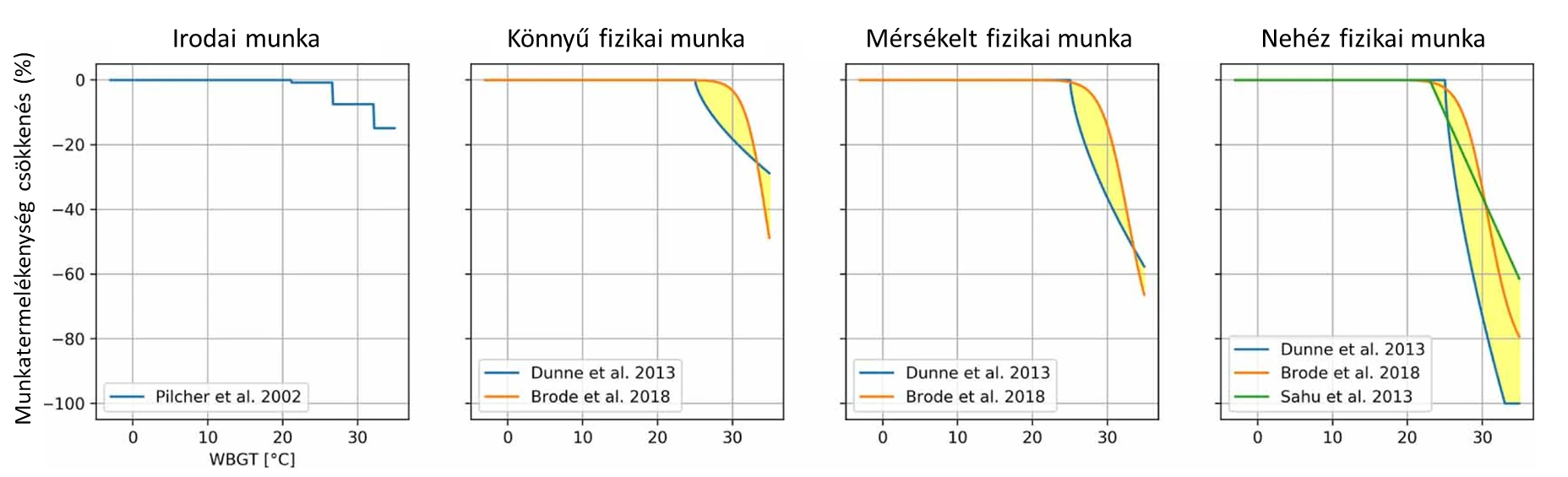 A munkavégzés során fellépő hőstressz becslésére kifejlesztett nedves gömb hőmérséklet (wet bulb globe temperature-WBGT) index a hőmérséklet, páratartalom, szélsebesség és napsugárzás függvényében jellemzi az emberi hőterhelést C°-ban kifejezve. Már a 24-26°C feletti WBGT esetén csökken munkatermelékenység,