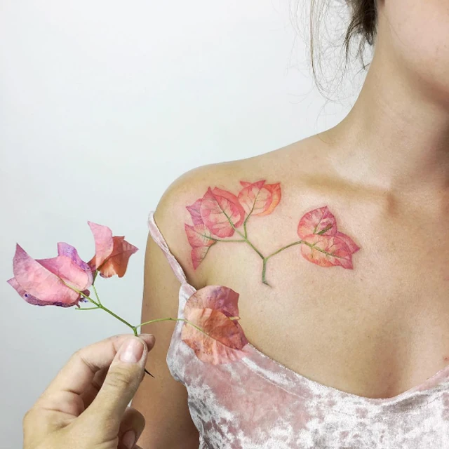 Eheti kedvencünk nem más, mint az ukrán Rita Zolotukhina, aki új ágazatot teremtett a művészetben. "Rit Kit" igazi virágokat és növényeket használ fel, és szuperrealisztikus tetoválásokat készít páciensei bőrére. Rit tintába áztatja a növényeket, majd a bőrre tapasztja őket, és azt dolgozza be a gépével, így valóban olyan végeredményeket láthatunk, mintha a egy virág hullott volna a bőrünkre. Ez Rit Kit kedvenc módszere, hiszen eszméletlenül természetes végeredmények születnek.