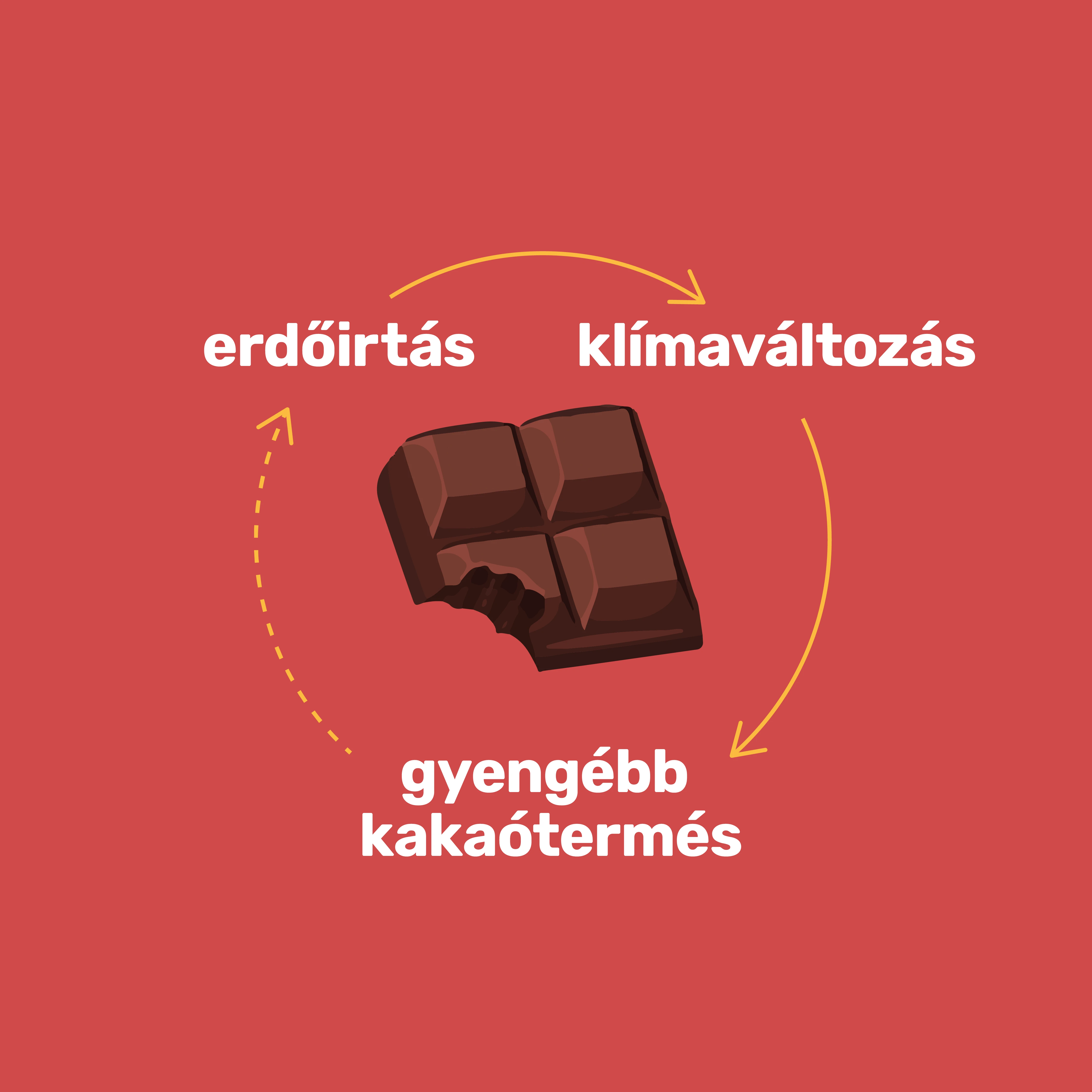 Felére csökkenhet a kakaótermesztésre igazán alkalmas területek nagysága a klímaváltozás miatt a 2040–2070 közötti időszakra, miközben az elmúlt évtizedekben csak a kakaótermesztés miatt több millió hektár erdőt irtottak ki, jelentősen hozzájárulva ezzel a klímaválsághoz. A csoki karbonlábnyoma így magasabb, mint több tejterméké, de egyes számítások szerint akár a baromfiét is meghaladja. Bár több klímabarát megoldás is lenne a hozamcsökkenés mérséklésére, megvan a kockázata, hogy újabb erdőirtásokkal próbálják biztosítani az exportot.