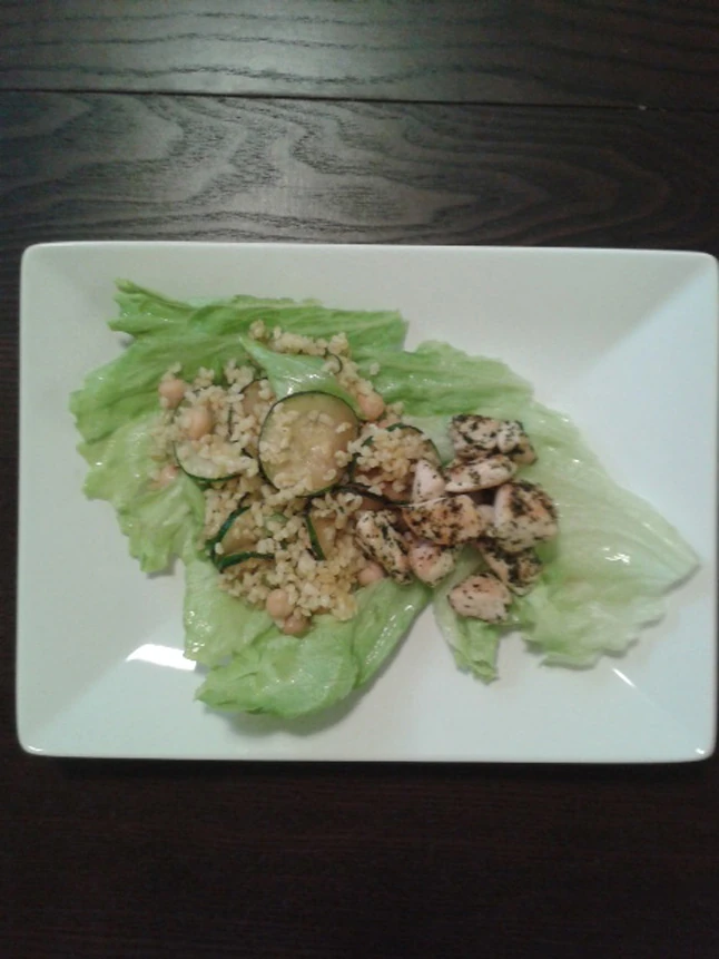 Hozzávalók: 250 gramm bulgur, 1 cukkini, 1 konzerv csicseriborsó, 2 evőkanál olivaolaj, petrezselyem, 1 db jégsaláta