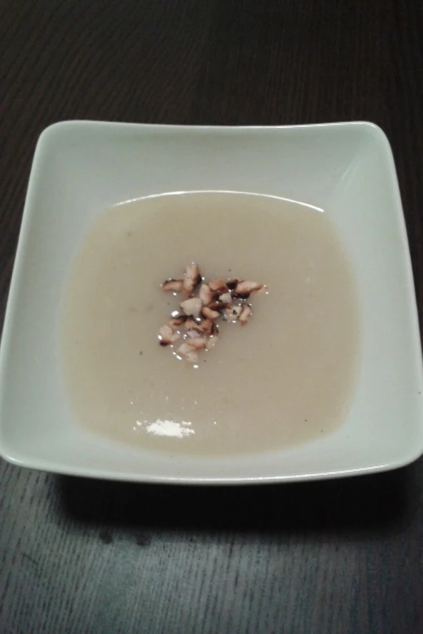 Hozzávalók: 600 gr csicsóka, 2 db fehérrépa, 7 dl zöldség alaplé, olivaolaj, 1 dl zsírszegény natúr joghurt, só, bors, 100 gramm dió megpirítva