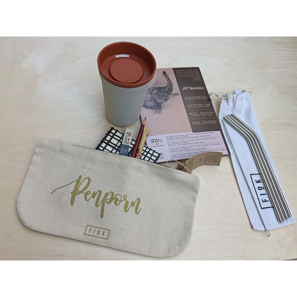 - Fiók ajándékcsomag, mely újrahasznosított anyagokból készült termékek mellett olyan darabokat tartalmaz, amelyek hosszú távon helyettesítik az egyszer használatos műanyag tárgyakat.
