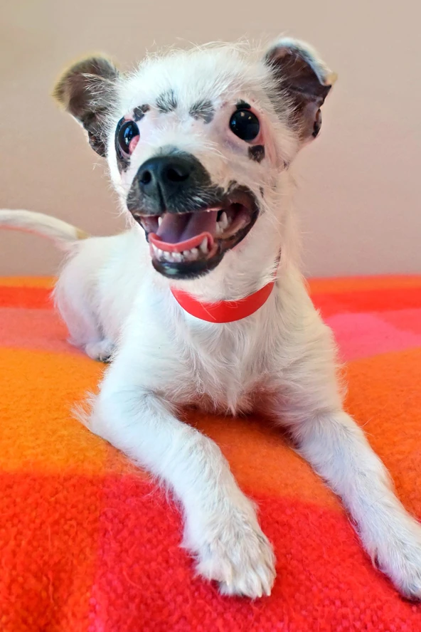 A kiskutya ismeretlen okokból eltorzított fejjel és szemekkel érkezett a menhelyre, ami vélhetően kémiai égések eredménye lehet. Az állatorvosok annyiban tudtak rajta segíteni, hogy a műtétnek köszönhetően megmarad a látása és nem érez semmi fájdalmat. A kutyus nagyon barátságos, szeret játszani, és furcsa szemei semmiben sem gátolják.
